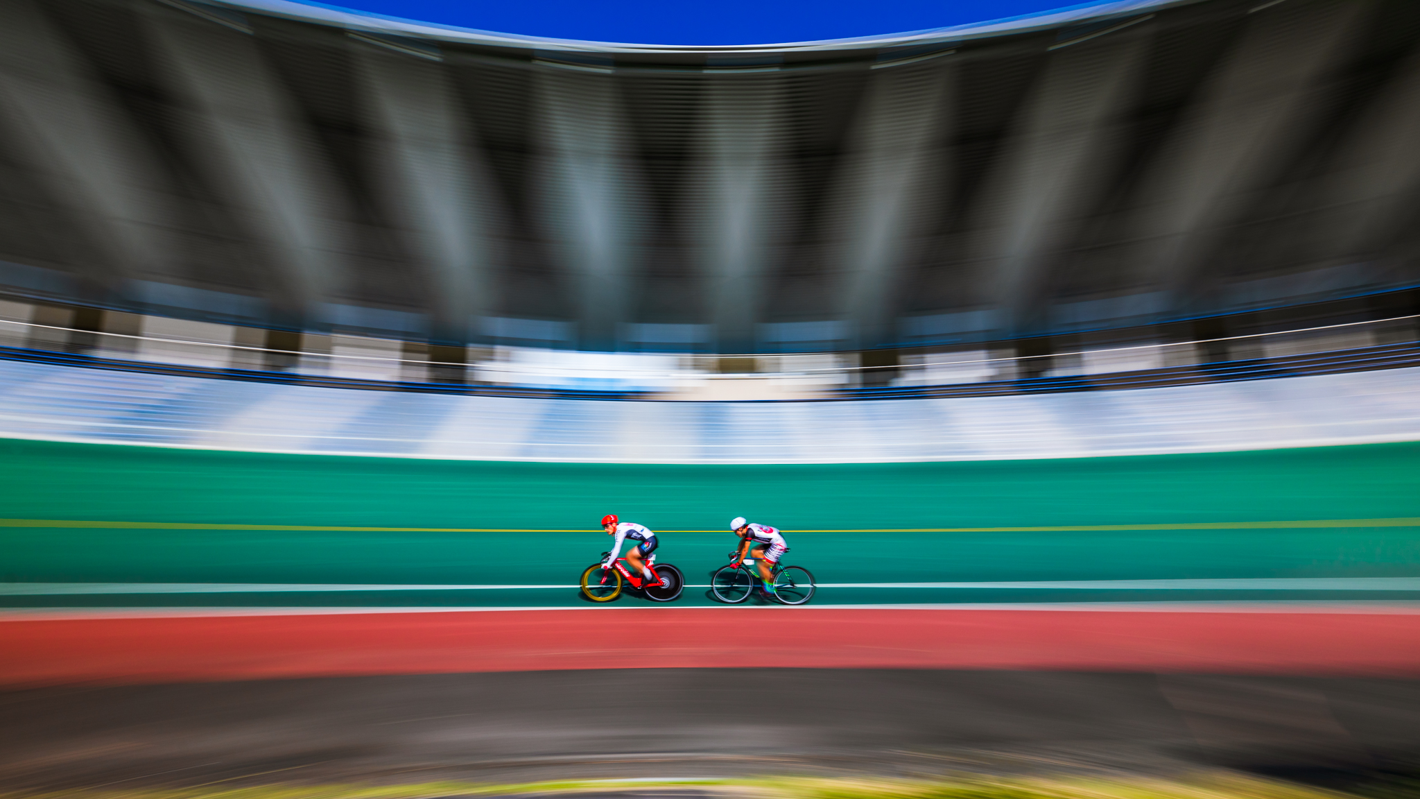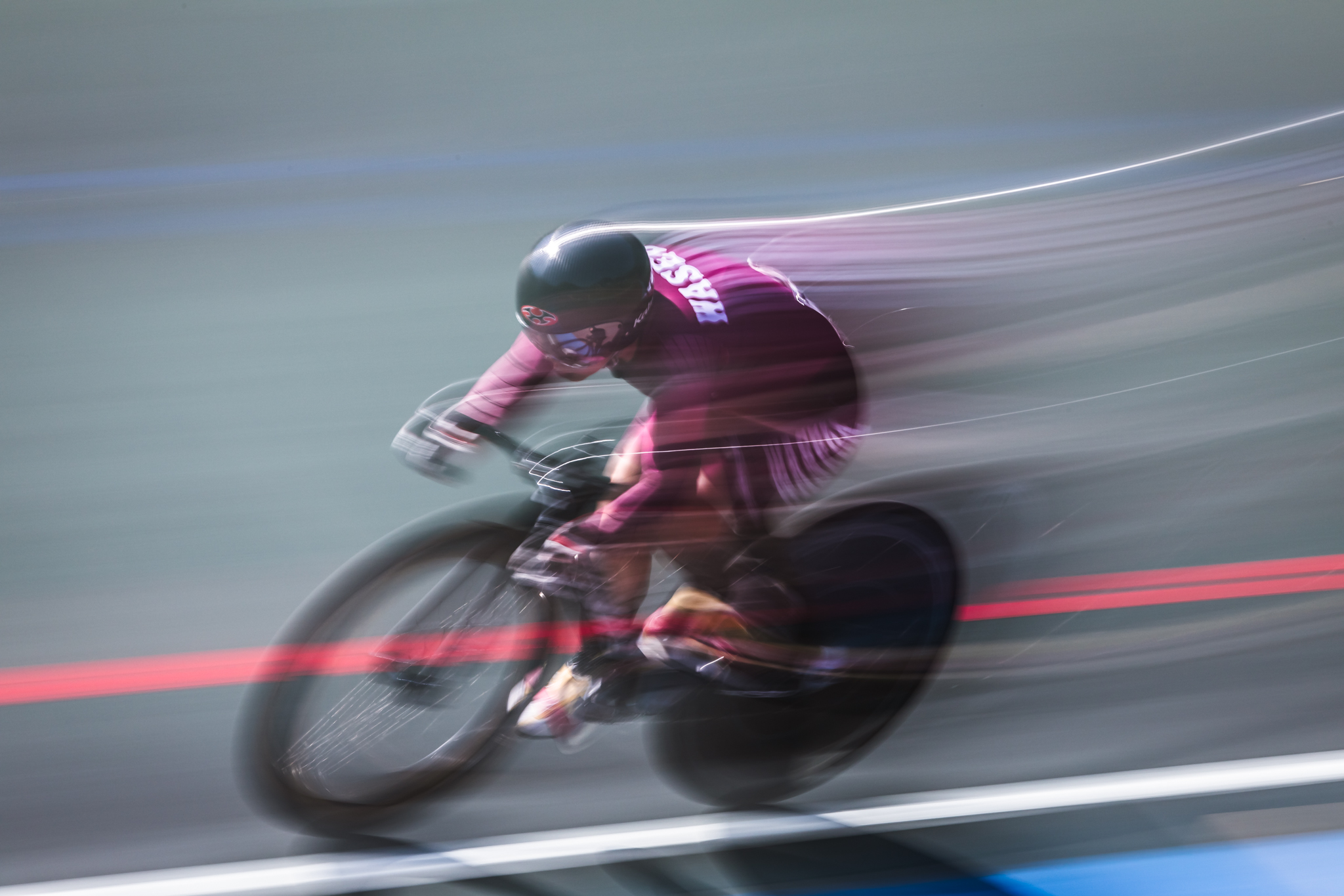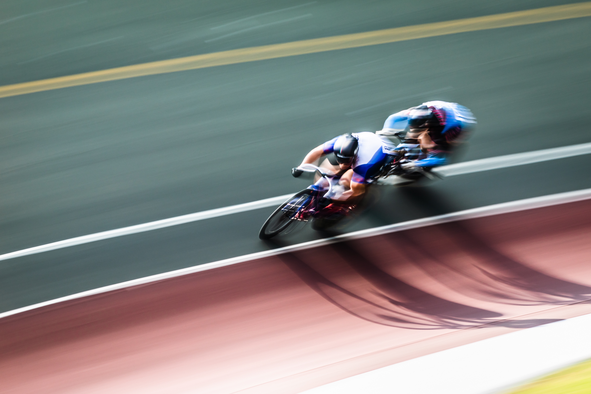 自転車専用トラックでのレース撮影はスピードもあって迫力満点ですが、モータースポーツのような急加速、急減速がないため、流し撮りの被写体として最適です。