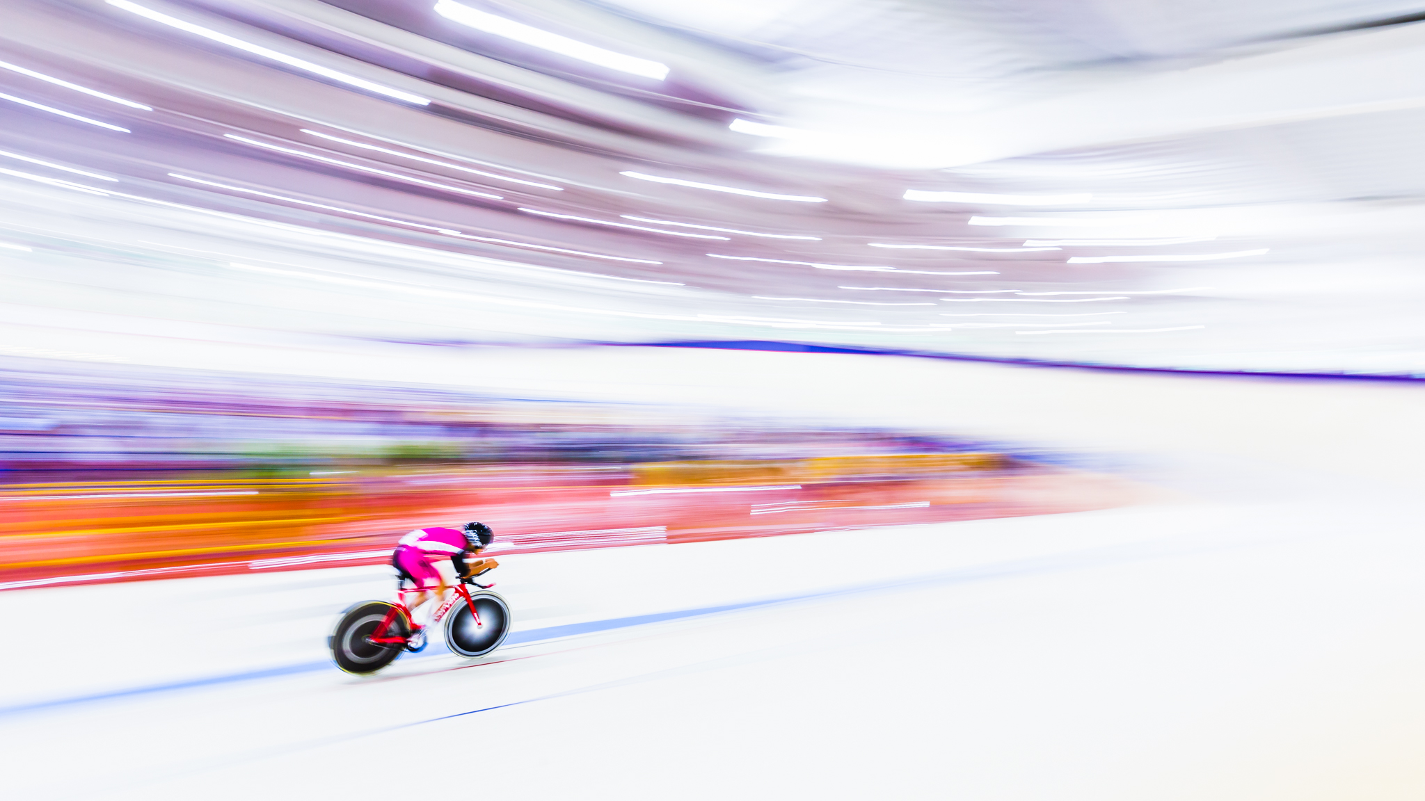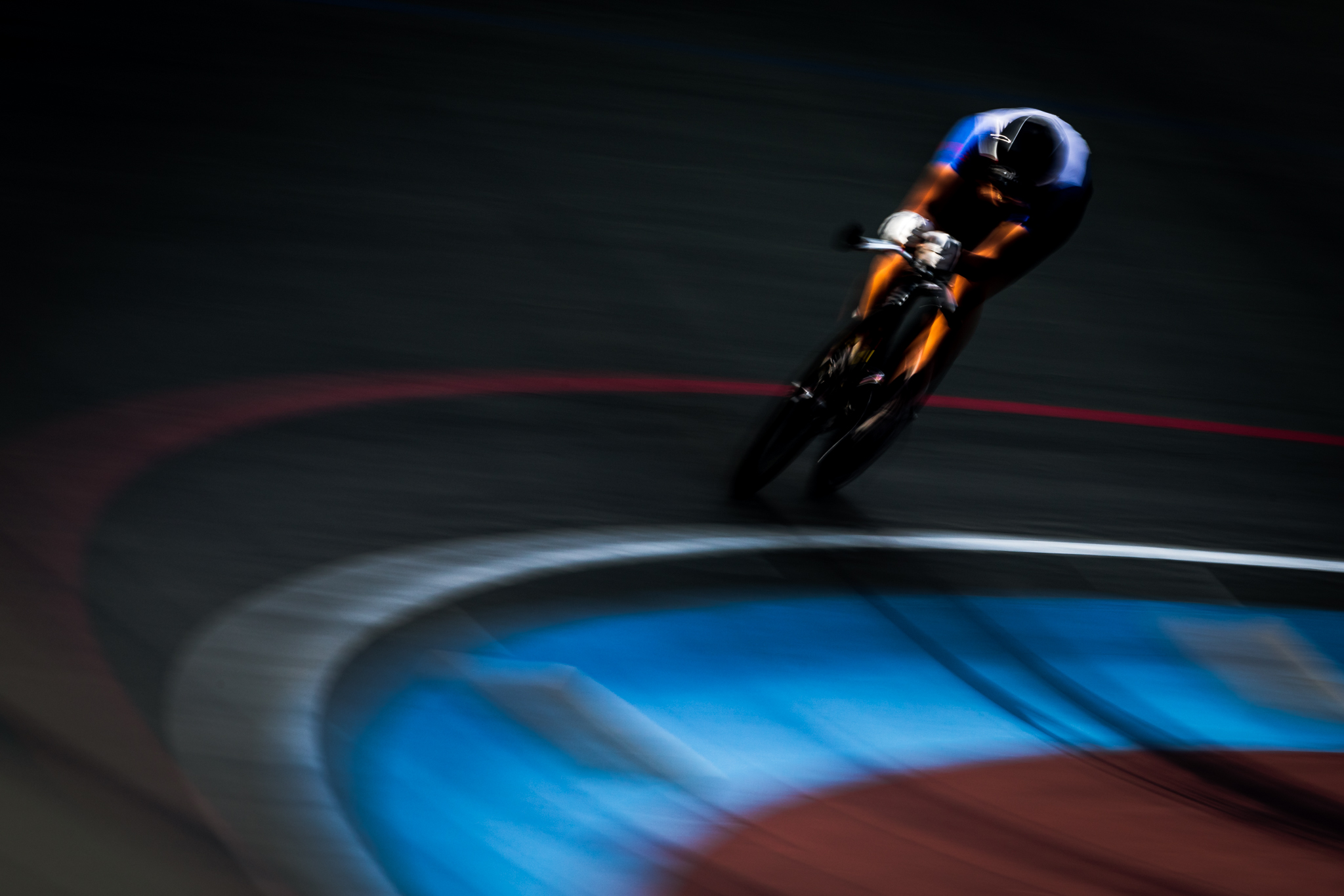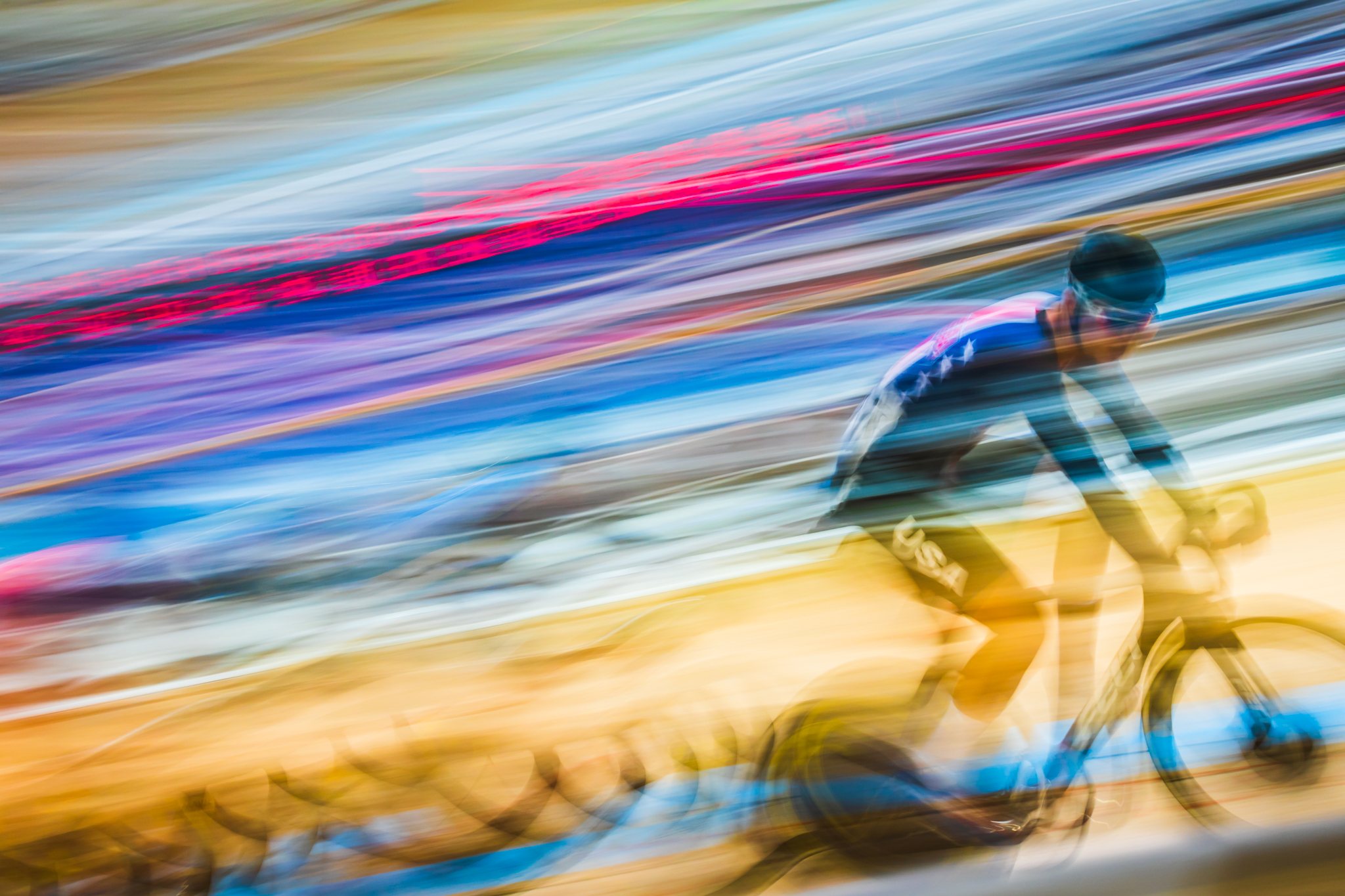 自転車専用トラックでのレース撮影はスピードもあって迫力満点ですが、モータースポーツのような急加速、急減速がないため、流し撮りの被写体として最適です。