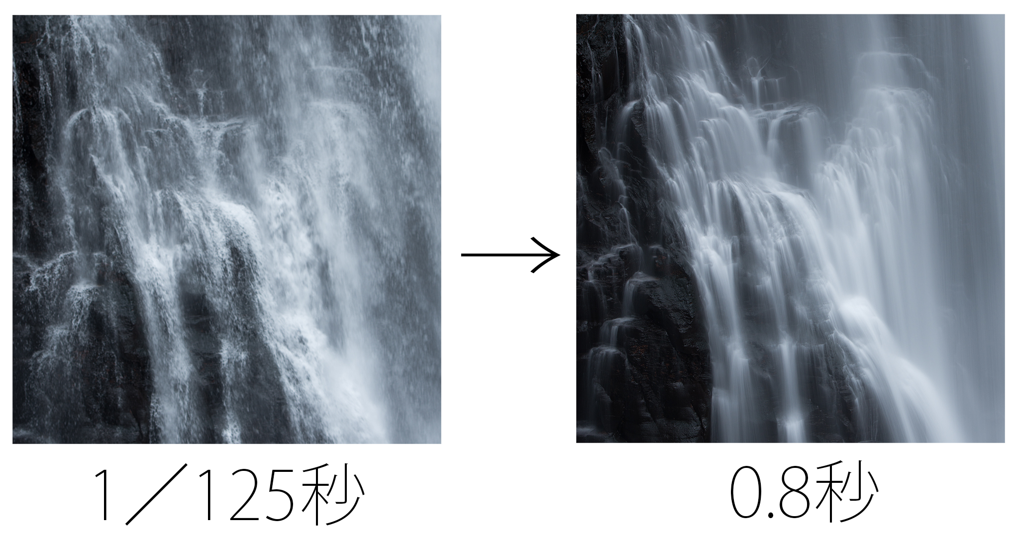 比較画像(右)のような描写になればシャッタースピードは1秒未満でも良いと思います。(ベストなシャッタースピードは滝・川の流れの緩急によります)。