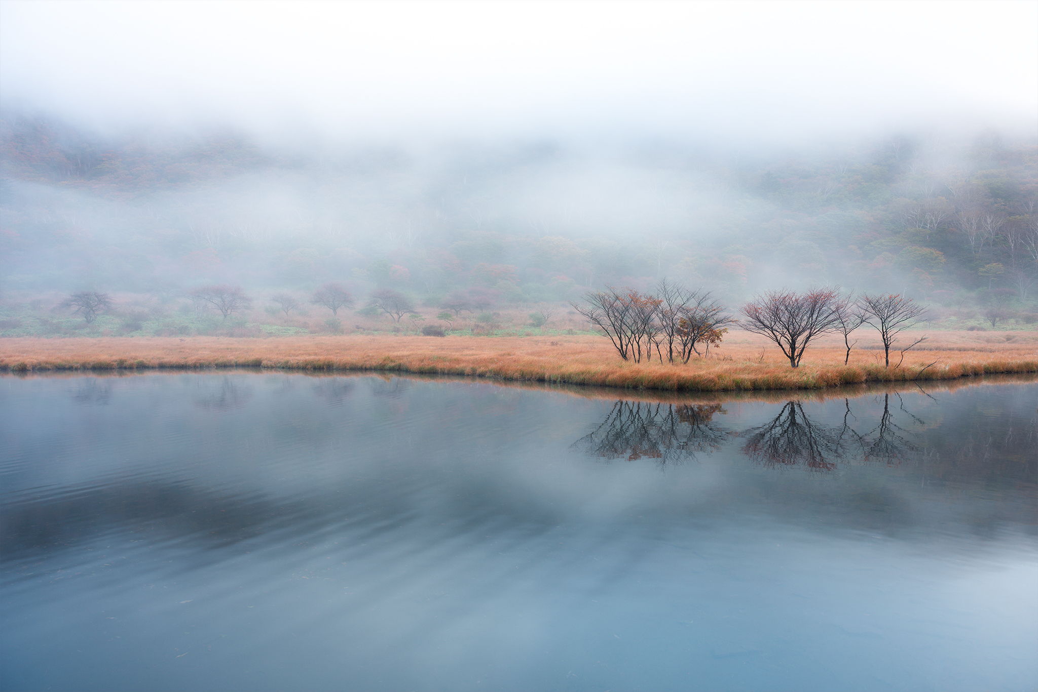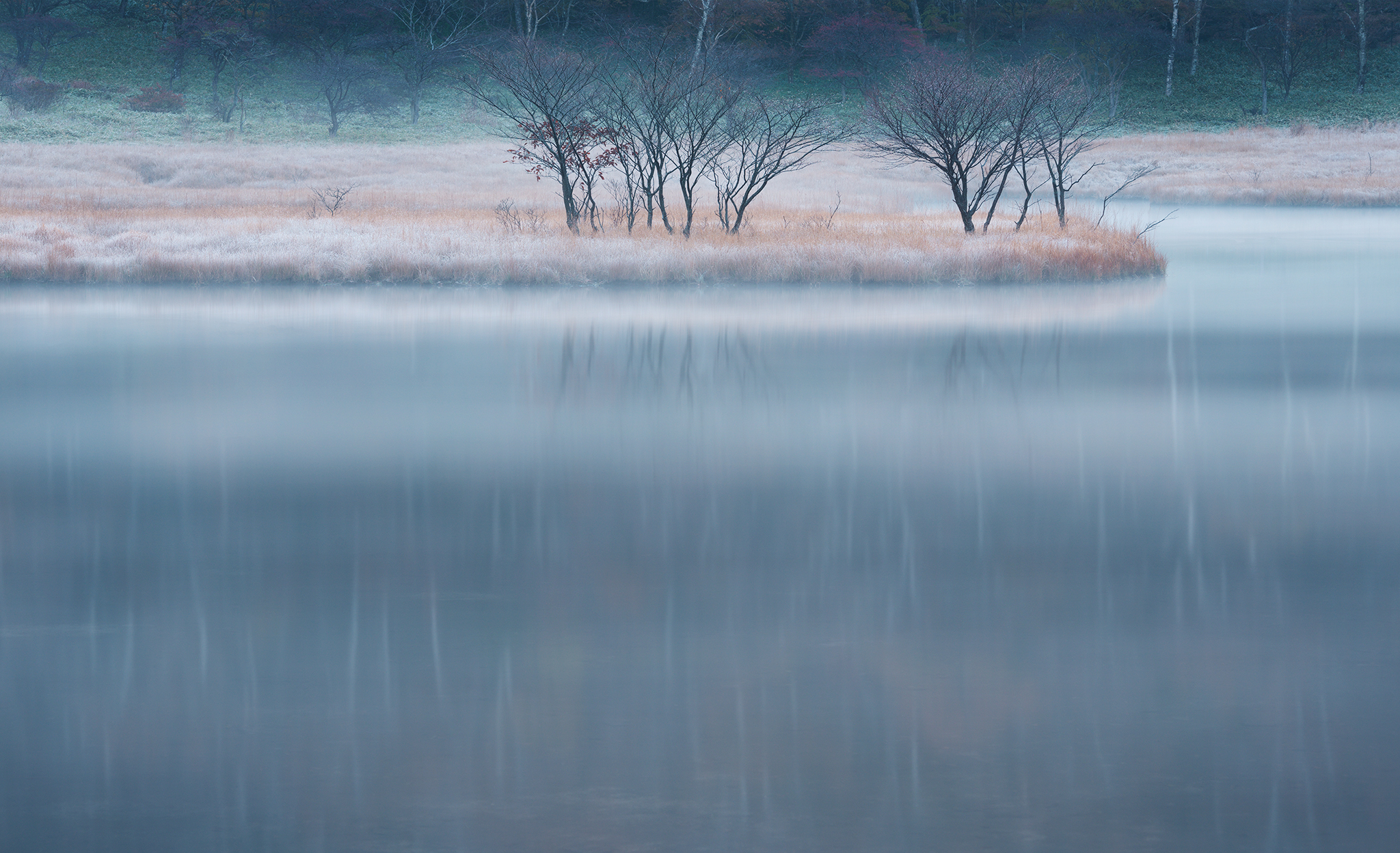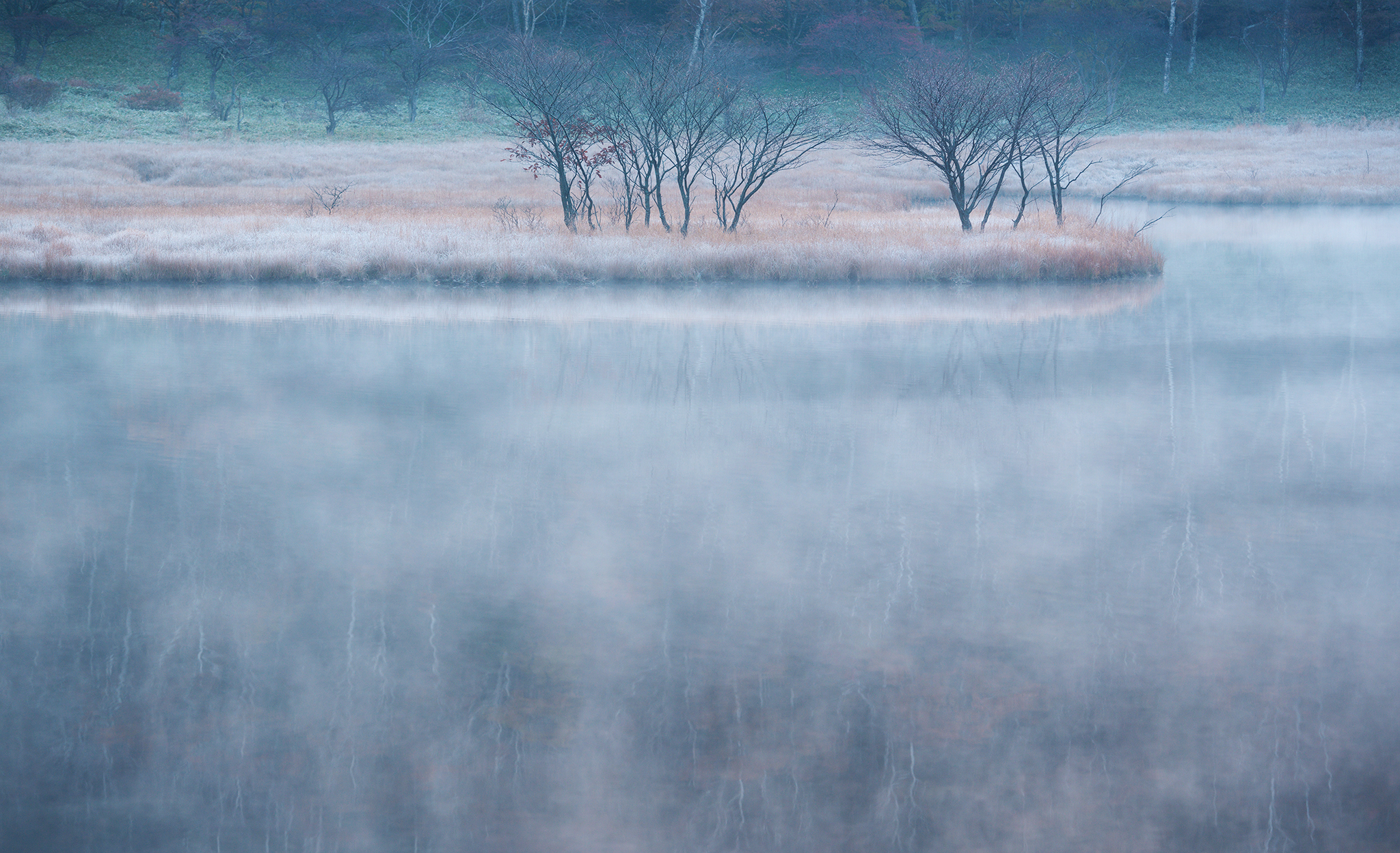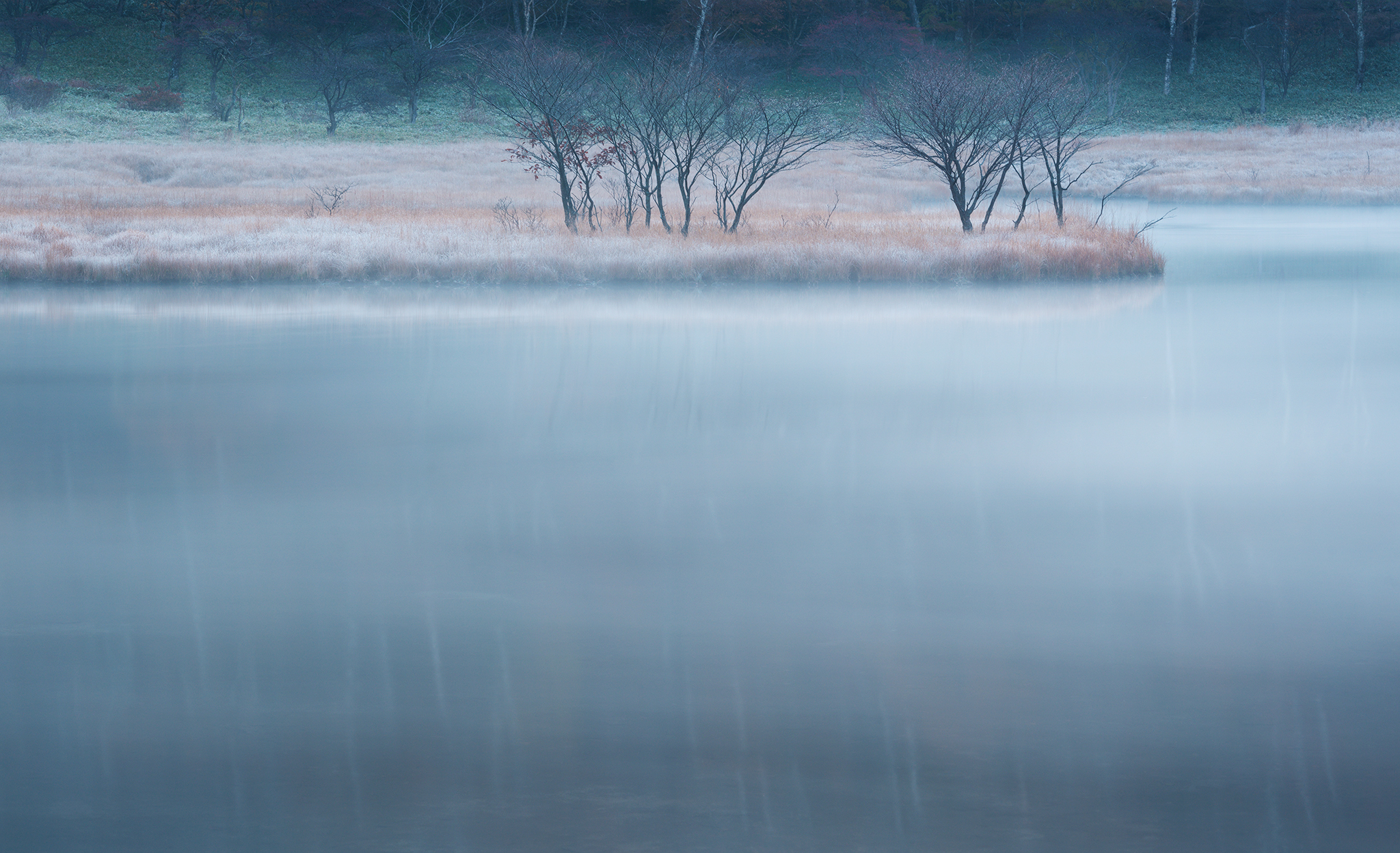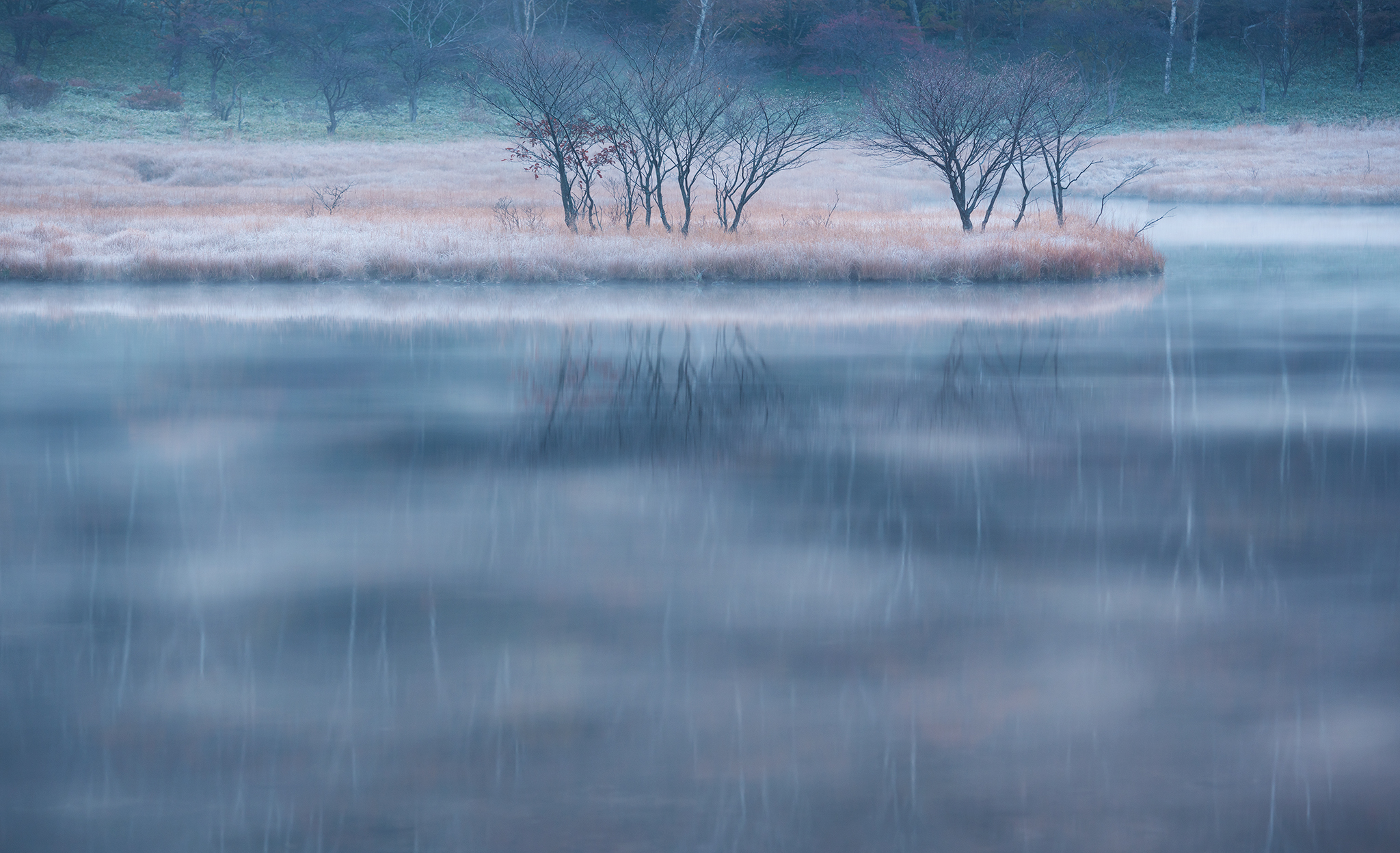 5秒のシャッタースピードとの水の表情の変化はそれほどありませんが霧の動き(ブレ)が完全に落ち着き横の縞模様となりました。より木々の映り込みが増えたために自然の息遣いが聞こえるような繊細な表情になったと思います。