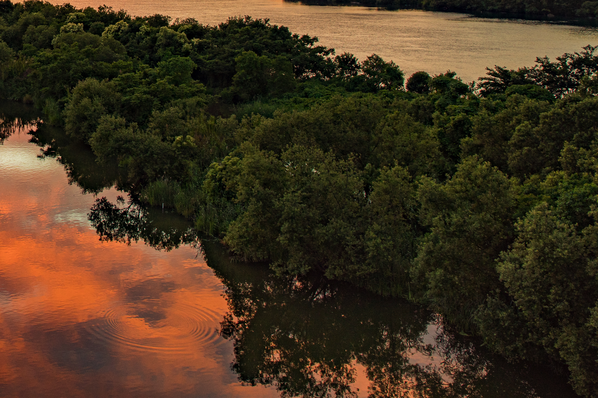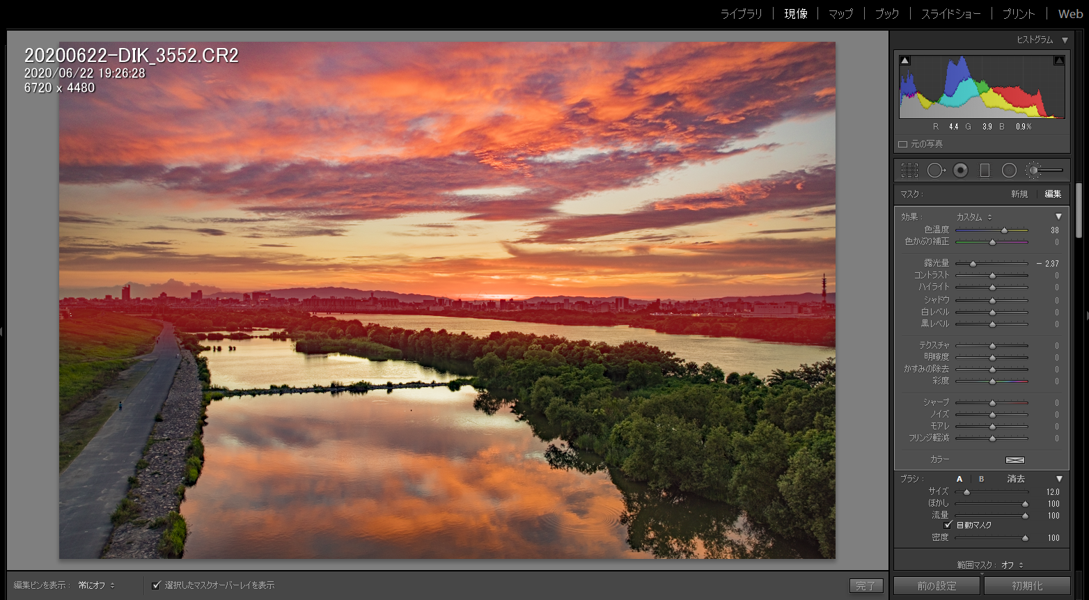 ここでも焼け空に必須のGNDフィルターを使っています。フィルターのある・なしでは、画面中央から右側にある中洲の樹々の色とクオリティが違ってきます。フィルターがないと、シャドウを持ち上げてもザラザラで立体感に乏しいディテールになります。川面への映り込みも、現像前からきれいに見えているので、無理にシャドウを持ち上げる必要がありません。