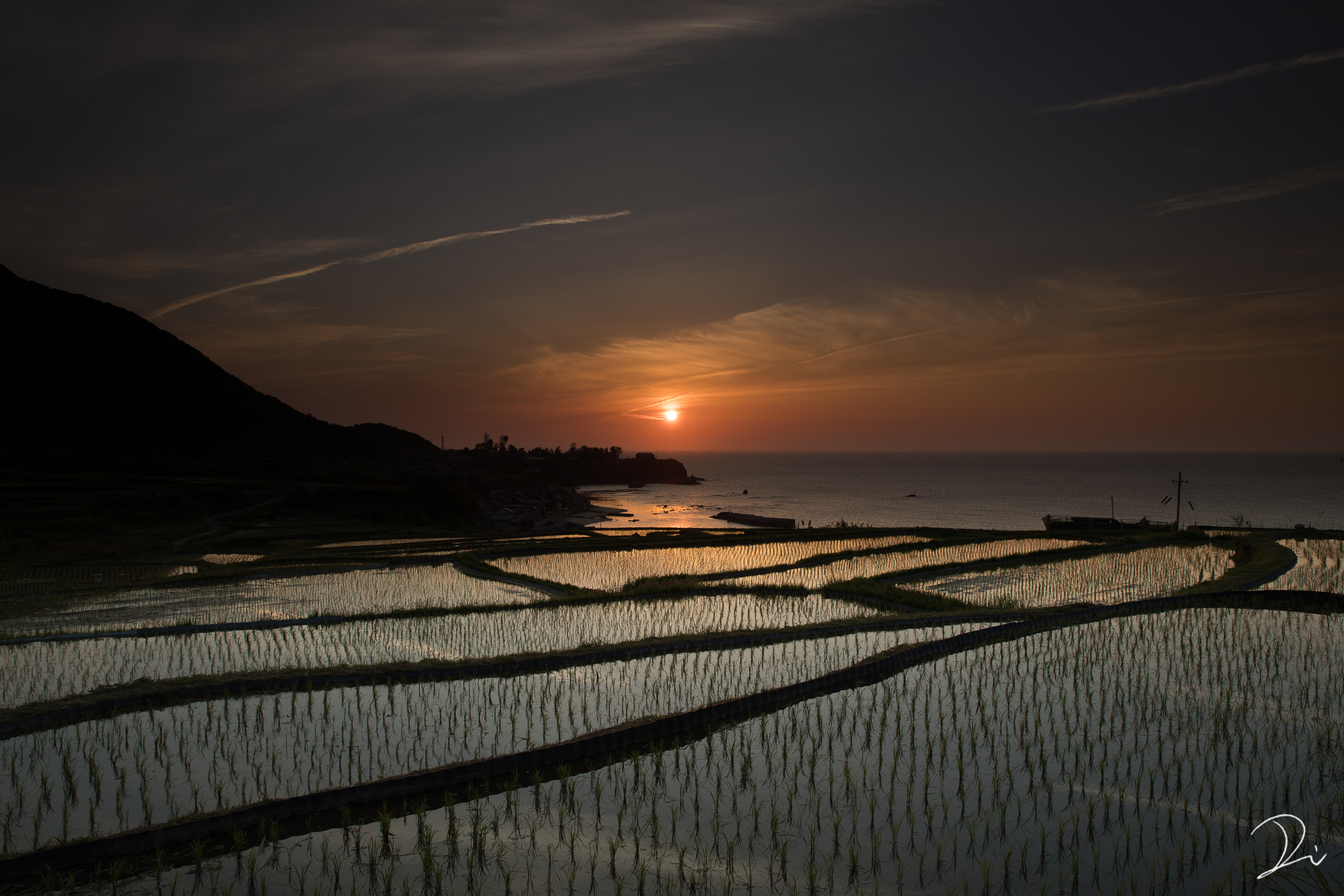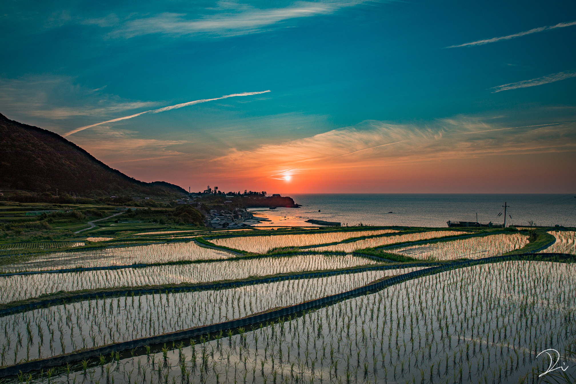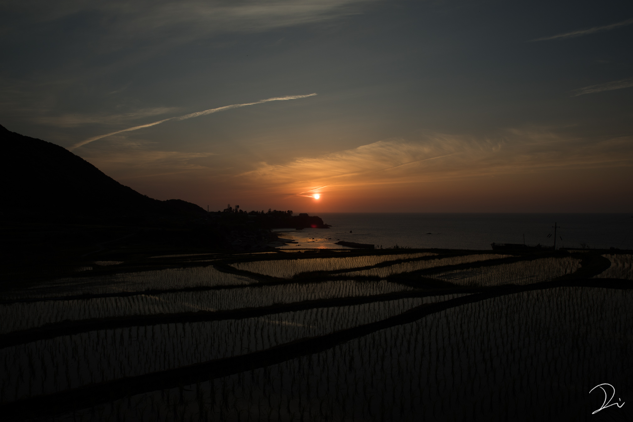 険しい山々と日本海に挟まれた扇状地の棚田。海に沈む夕陽と棚田へのリフレクションが狙える場所です。撮影日は5月の下旬。水が張られた棚田の稲はやや育っていますが、ギリギリ水面への映り込みが見られました。