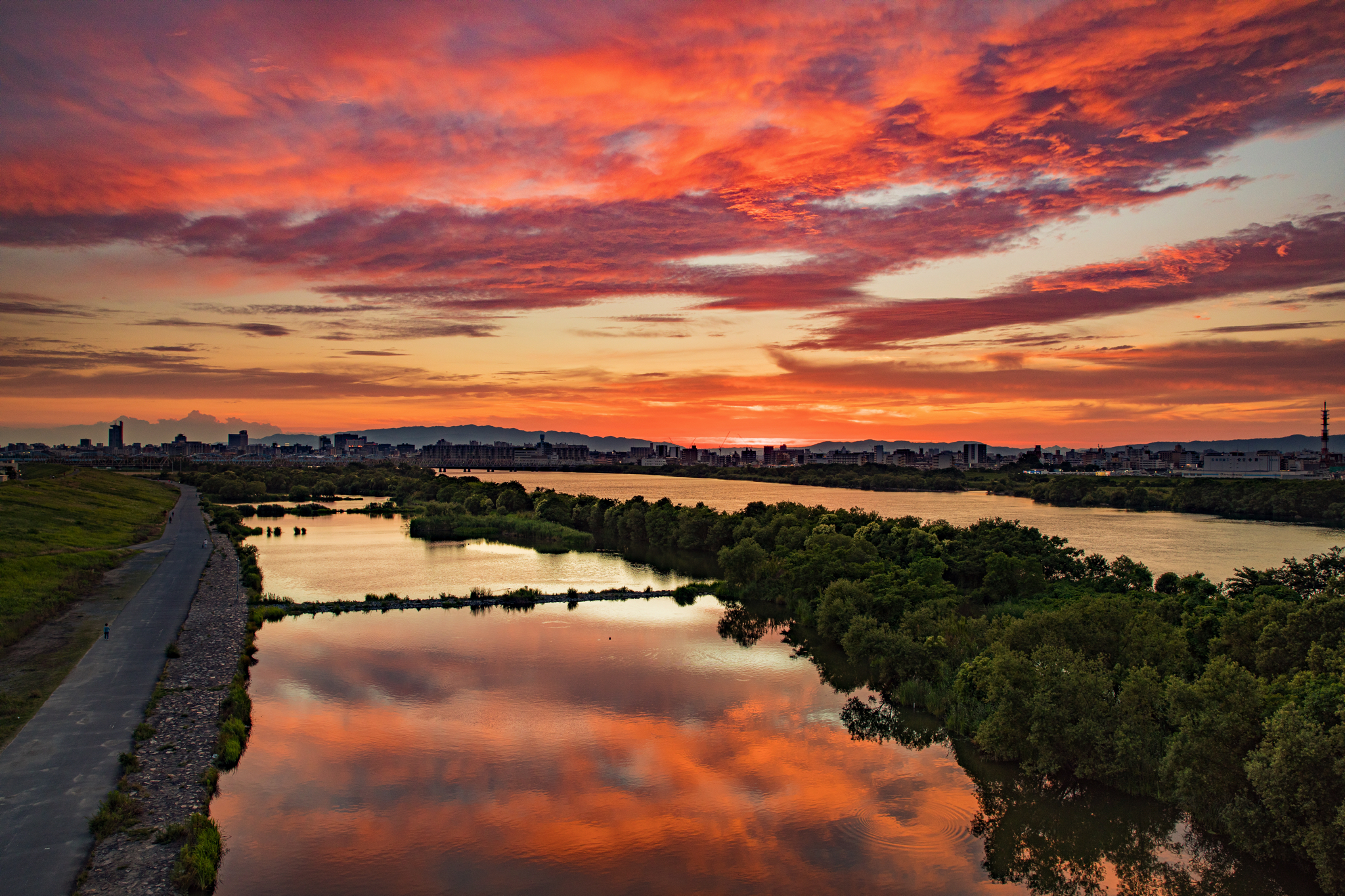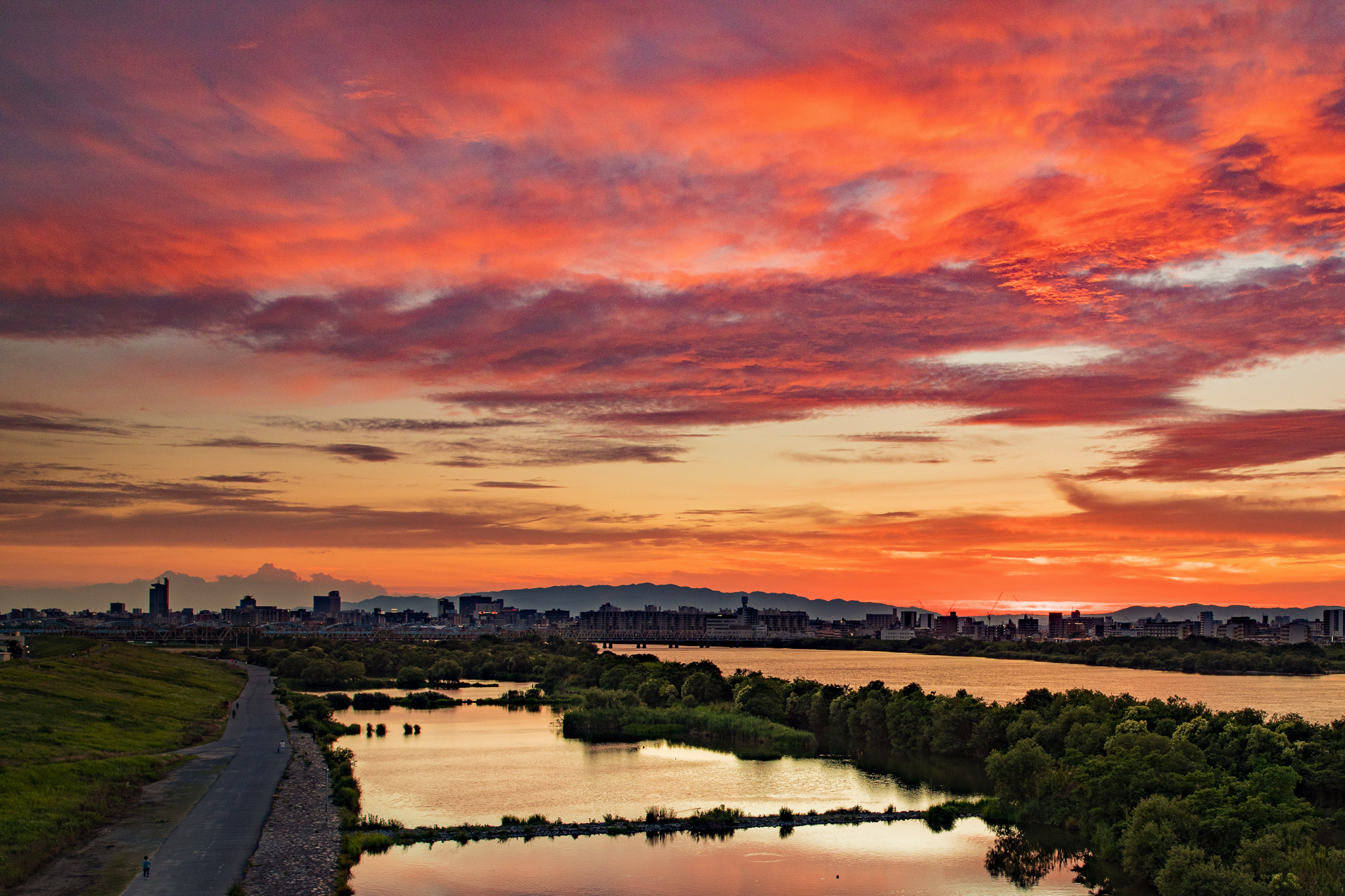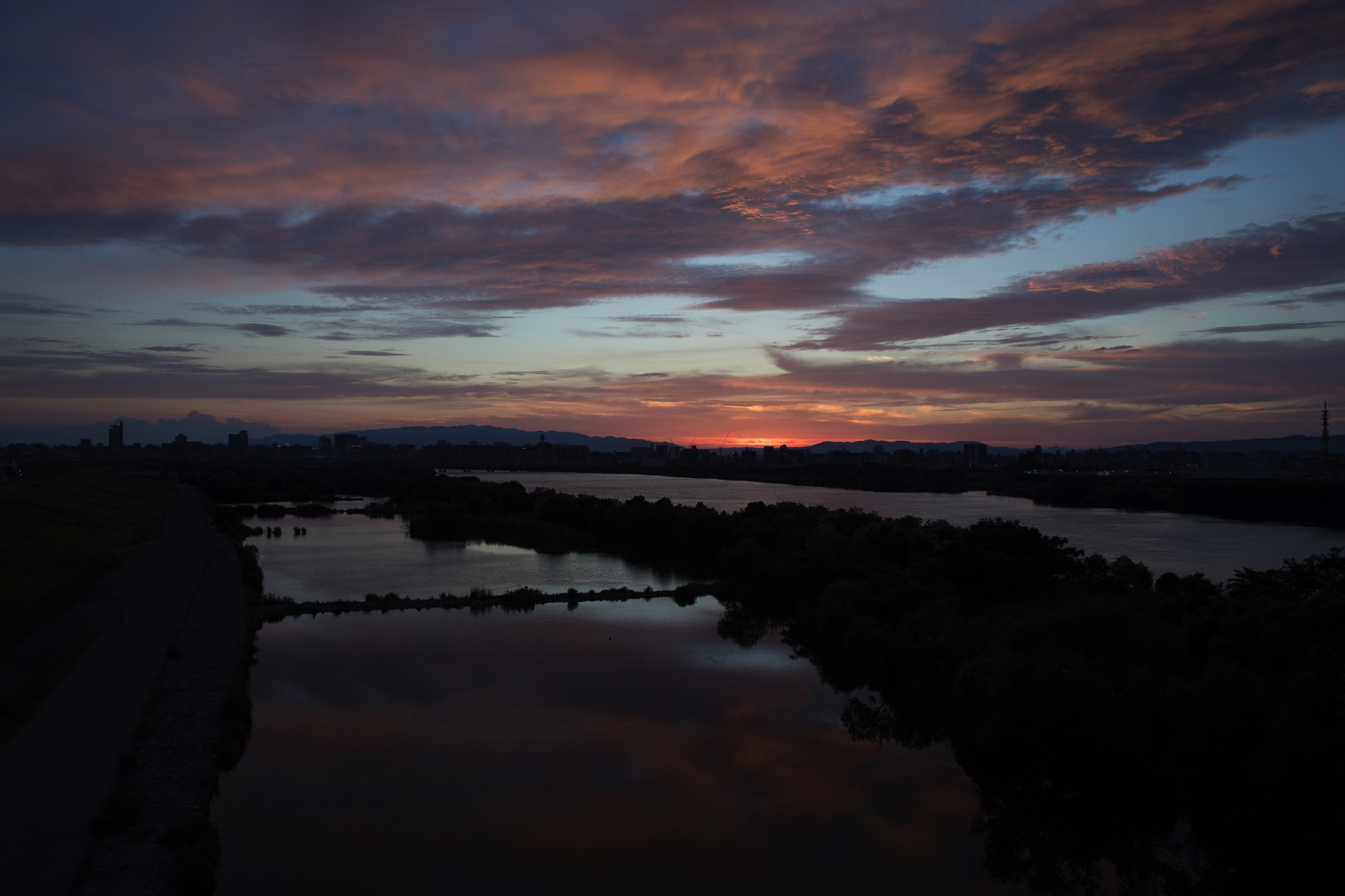 家からほど近い河川敷で撮影した夕焼けです。会社にはいつもカメラを持って行きますが、フィルターを使ってしっかり撮りたいときは三脚が必須なので、一度帰宅してからカメラリュックを背負ってフル装備で撮影に向かいます。