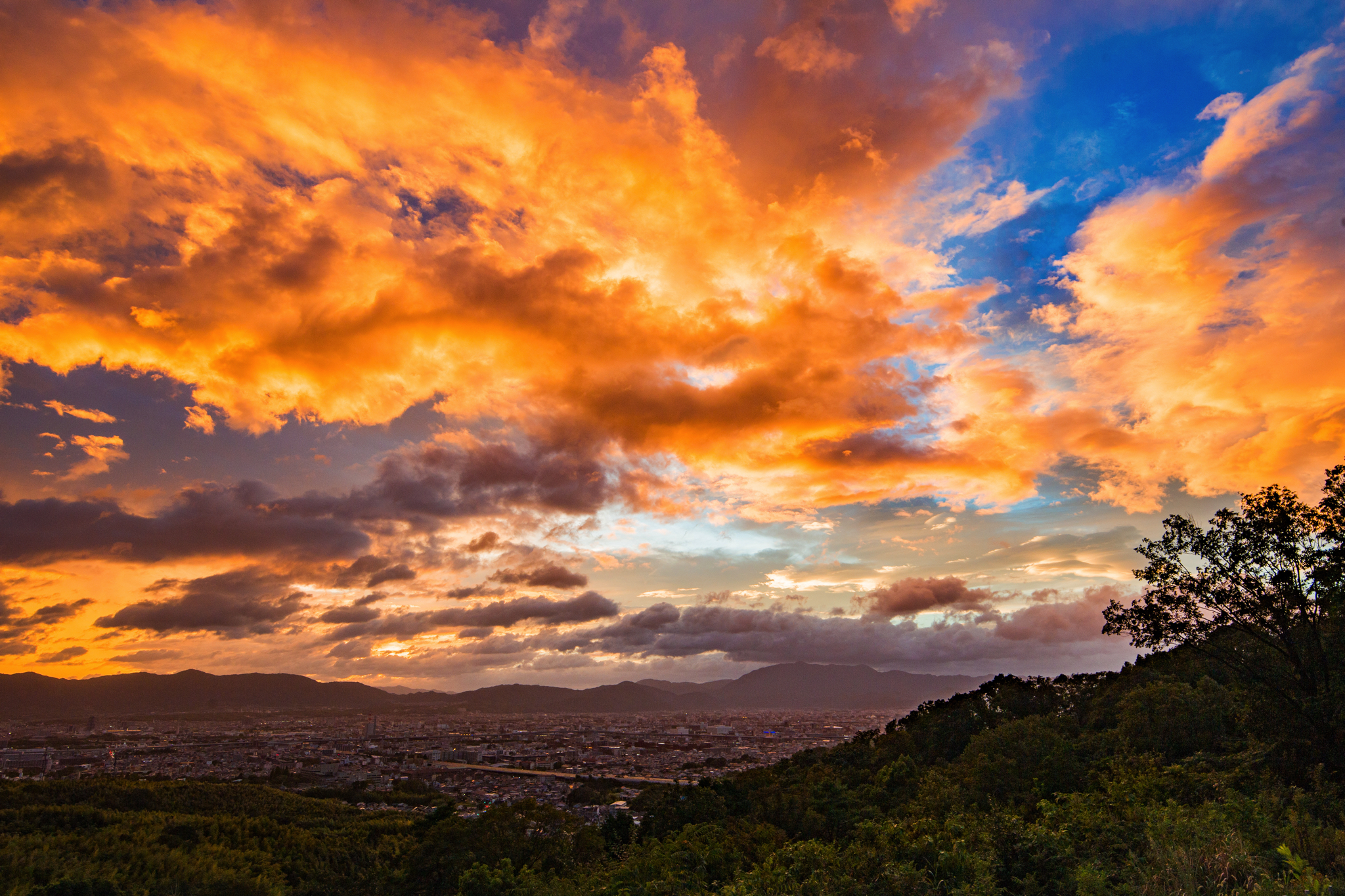 焼け空は最も美しいのは夏から初秋にかけて。7~9月頃はダイナミックな焼けが見られることが多いです。その理由は、積乱雲や羊雲など塊の雲ができやすいから。完全に晴れると、沈みかけた太陽の光を受ける雲がないので、オレンジ色の焼け空になるだけです。かといって、太陽の光を遮断する厚雲や全体を覆う薄雲があると焼けません。ある程度の塊で、なおかつ隙間のある雲が爆焼けを起こしやすいです。気温が高い夏場はそういう雲ができやすいため、焼けのチャンスが多くなります。