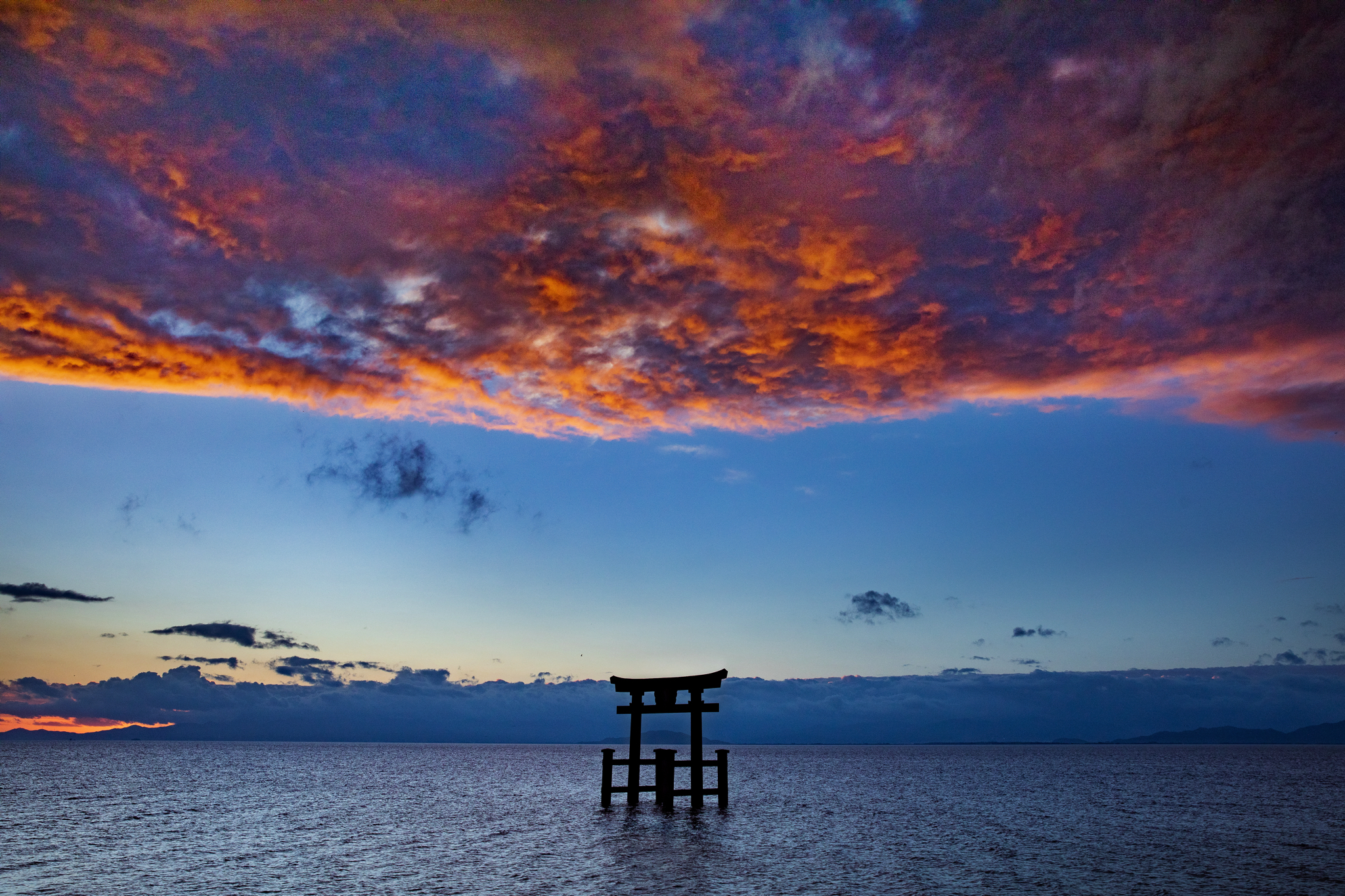 白髭神社で撮影していて、もう焼けないかと車に戻りかけたら、この爆焼け。日の出後もこんなに焼けることがあります。