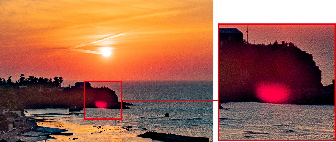 GNDフィルターなしで撮影(現像後)。岩場に赤いゴーストが生じています。かなり目立ちます!