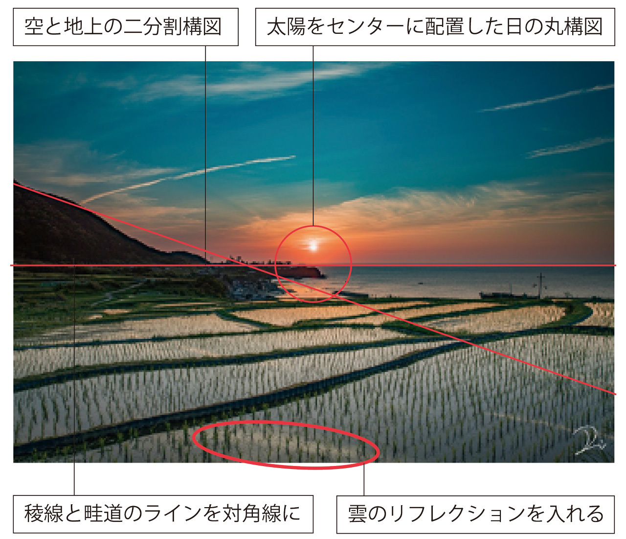 棚田へのリフレクションを狙っていましたが、焼けの赤みがさほど強くなかったので、雲の映り込みを入れてアクセントにしました。太陽を中央に入れたシンプルな日の丸構図は、「前景をどこまで入れるか」がとても重要になってきます。空と棚田の両方を見せたかったので、上下は完全なシンメトリーとなる二分割構図に。棚田のラインは入れ方が難しいところですが、山の稜線と棚田のラインがなんとなく対角線を描くような、気持ちのいい構図を意識しました。