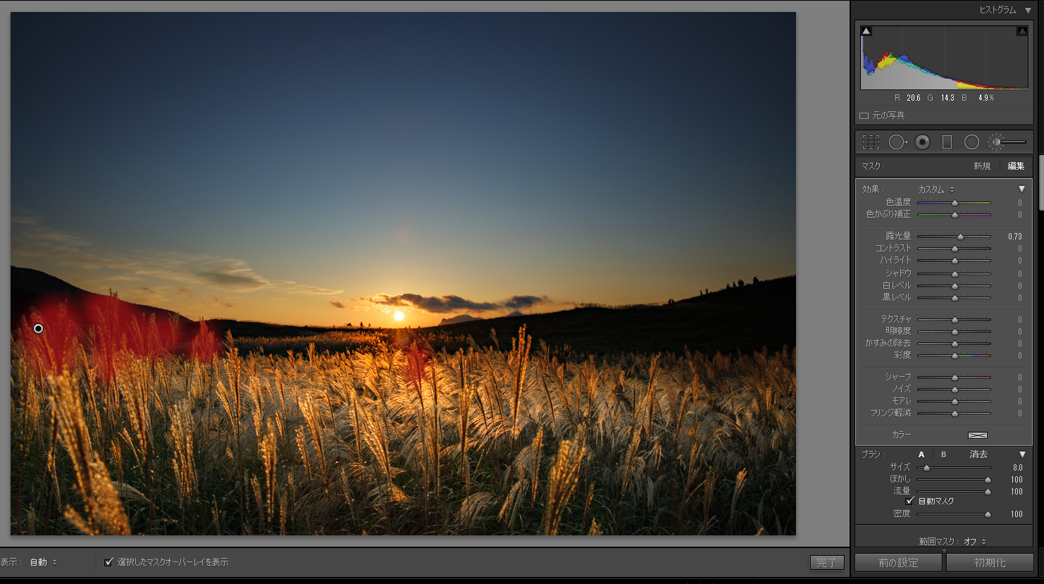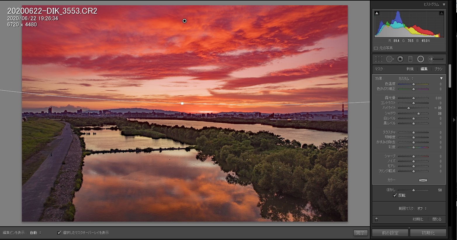 空の明るい部分の色を引き締めるために、円形フィルターを大きめに使って、ハイライトを下げてシャドウを上げるなど微調整します。