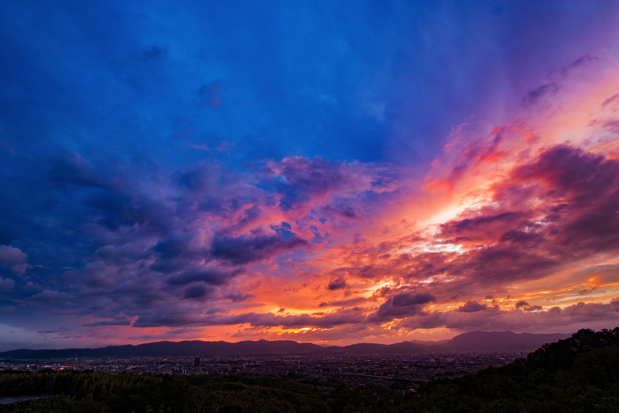 綺麗に空が焼けるのは、日の出・日の入りの40~50分前後です。たとえば日没時間が19時なら、余裕をもって18時から待機して20時まで撮影することが多いです。