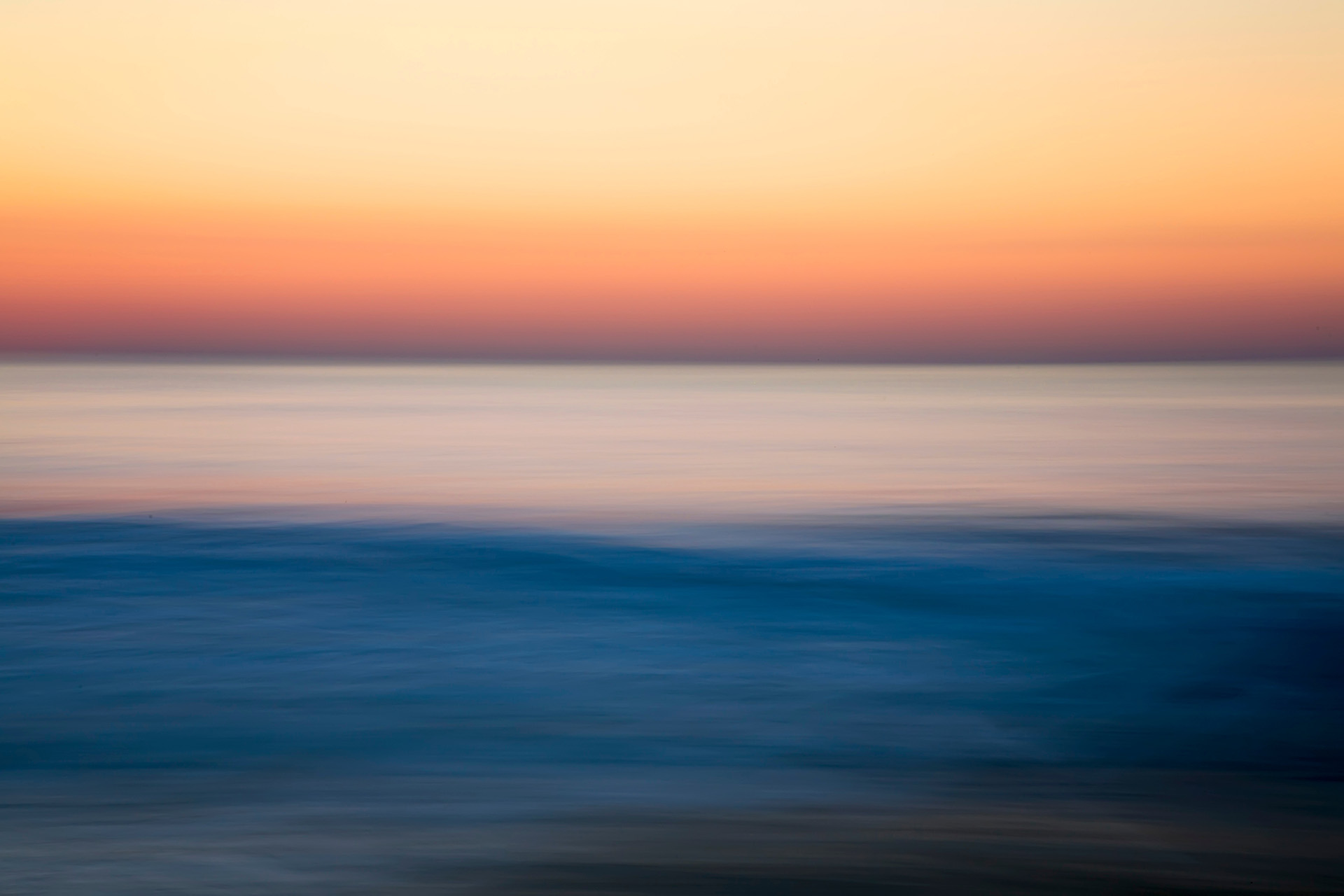 海岸の印象派写真の成功の秘訣は、鮮やかな色彩、美しい光線があること。夕焼け空のオレンジと海の青に加えて、画面中央の白い帯は、波のうねりが残した痕跡で、これがあることでさらに一つ写真に面白みが加わっている。