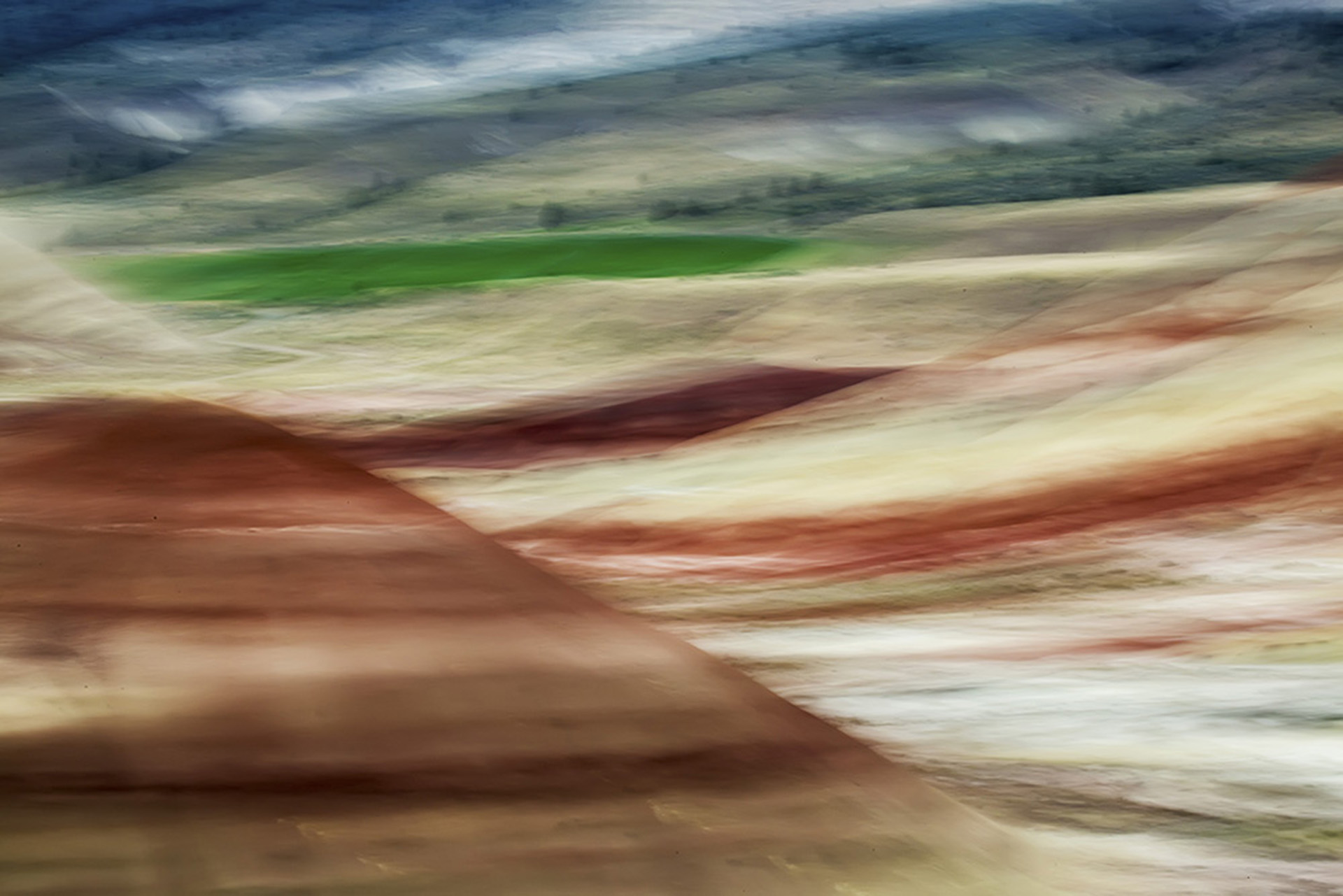 色彩と形のはっきりした部分、つまり赤い大地、浅黄色の作物と緑の草地の部分の配置を考えながら慎重に構図を選んだ。西日が強かったので、NDフィルターをつけて露光時間を2秒まで落として撮影を始めたが、期待どおりの結果が得られず、撮影方法をいろいろ変えてみた。カメラを動かす速度、カメラの方向、左へ、右へ、あるいは左右に振ったりしてみた。最後にこの作品、シャッタースピード0.6秒、左右に小幅に振ったものが最良の結果となった。小幅にカメラを動かす方法は、被写体の輪郭が抽象化されるものの、それが何であるか認識するのに十分な情報が残されるため、ここが赤い大地だとすぐにわかる。