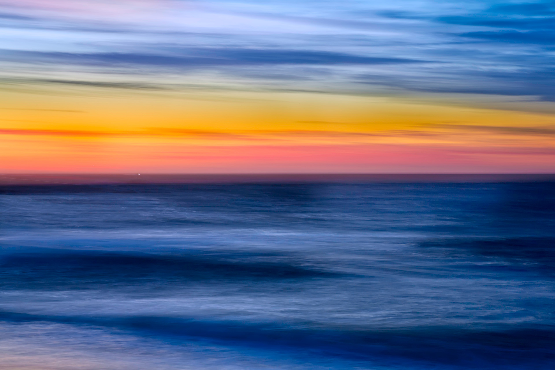 夕暮れ時の海辺でパンニング写真を撮ると、寒色系の海面と空の間に一筋の暖色が加わり色彩の幅が増すため、写真が単調になることを防げる。このように、同じ波打ち際で撮った写真も、時間や光の具合で異なる写真となり、まさにモネの手法とよく似ている。モネの印象派絵画は異なる時間と光の条件下で、同じ対象を何枚も描くことで、大自然が醸し出す光の変化の瞬間を捉えようとしていた。