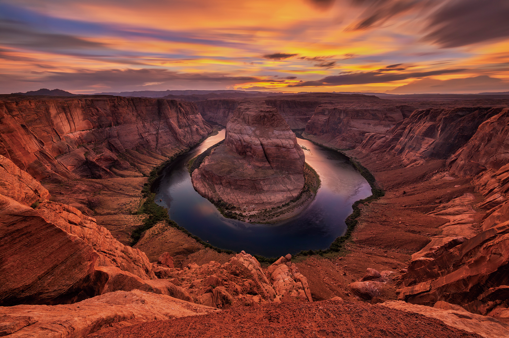 ホースシューベンド(Horseshoe Bend)はアリゾナ州・コロラド川がU形に蛇行している場所で、グレンキャニオン国立保養地(Glen Canyon National Recreation Area)に属する観光地の一つである。馬の蹄に形が似ているため、ホースシューベンドと名付けられた。ここの土質は豊富な鉄とマンガンが含まれているため、赤みを帯びたオレンジ色に見える。この作品は、太陽が落ちたばかりのゴールデンアワーに撮影したもので、太陽の角度は低く、厚みの調度良い雲が合わさり、寒色のブルーの光は屈折の為に画面には入らず、残された橘赤色と黄金色の光が雲を照らしていた。