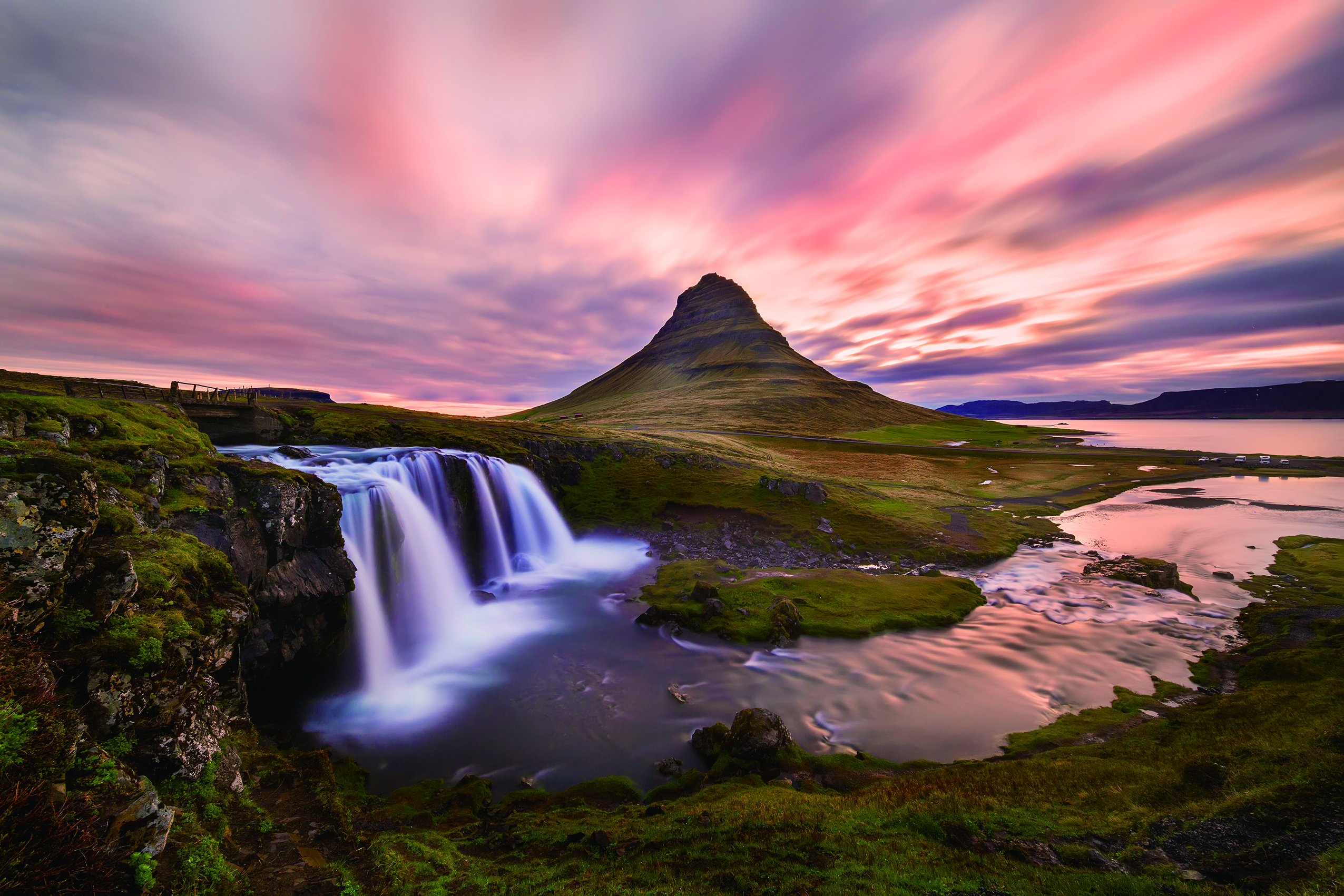 変化の多いアイスランドの天気は写真家に無数の驚きをもたらす。太陽が出た時、柔らかい光の下に雲の動きと色彩が浮かび上がったので、ND1000を用いて移動する雲の軌跡を取り込んだ。雲はキルキュフェットル山から外へと散っていき、写真に動感と奥行きを加えている。この写真は全体として四つの動静の交わりで成り立っている。ダイナミックな雲、悠然と座るキルキュフェットル山、左から右に流れる滝と水の流れ、そして支えになる静的な草地の絨毯である。