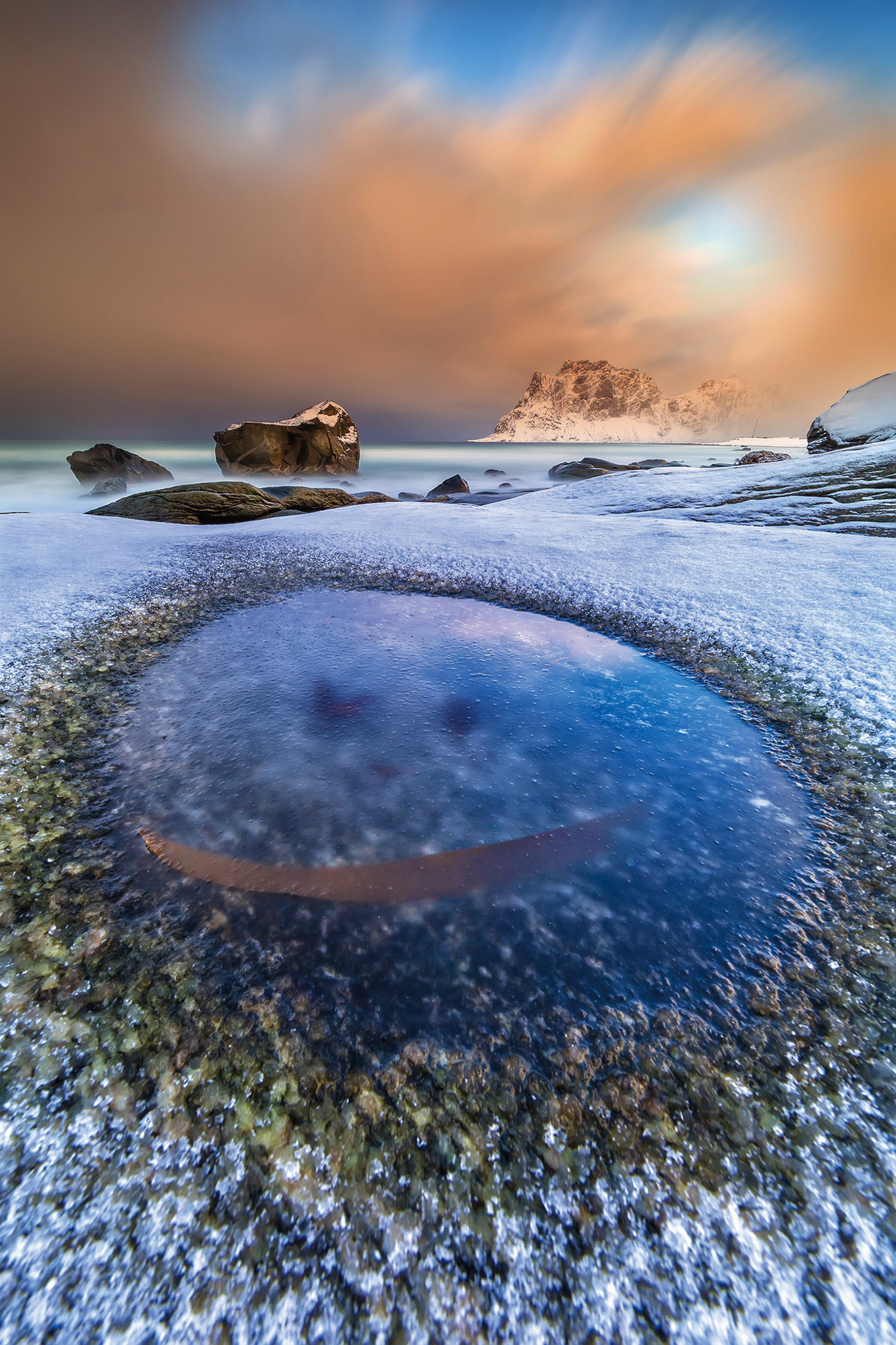 これはノルウェーのロフォーテン(Lofoten) 諸島で有名なUttakleivビーチだ。非常に人気のある撮影スポットである。何故なら雄大な山の峰を背景に、前景が多様で、無数の創作空間を秘めているからだ。しかし、インパクトのある前景を探すには、工夫が必要だ。