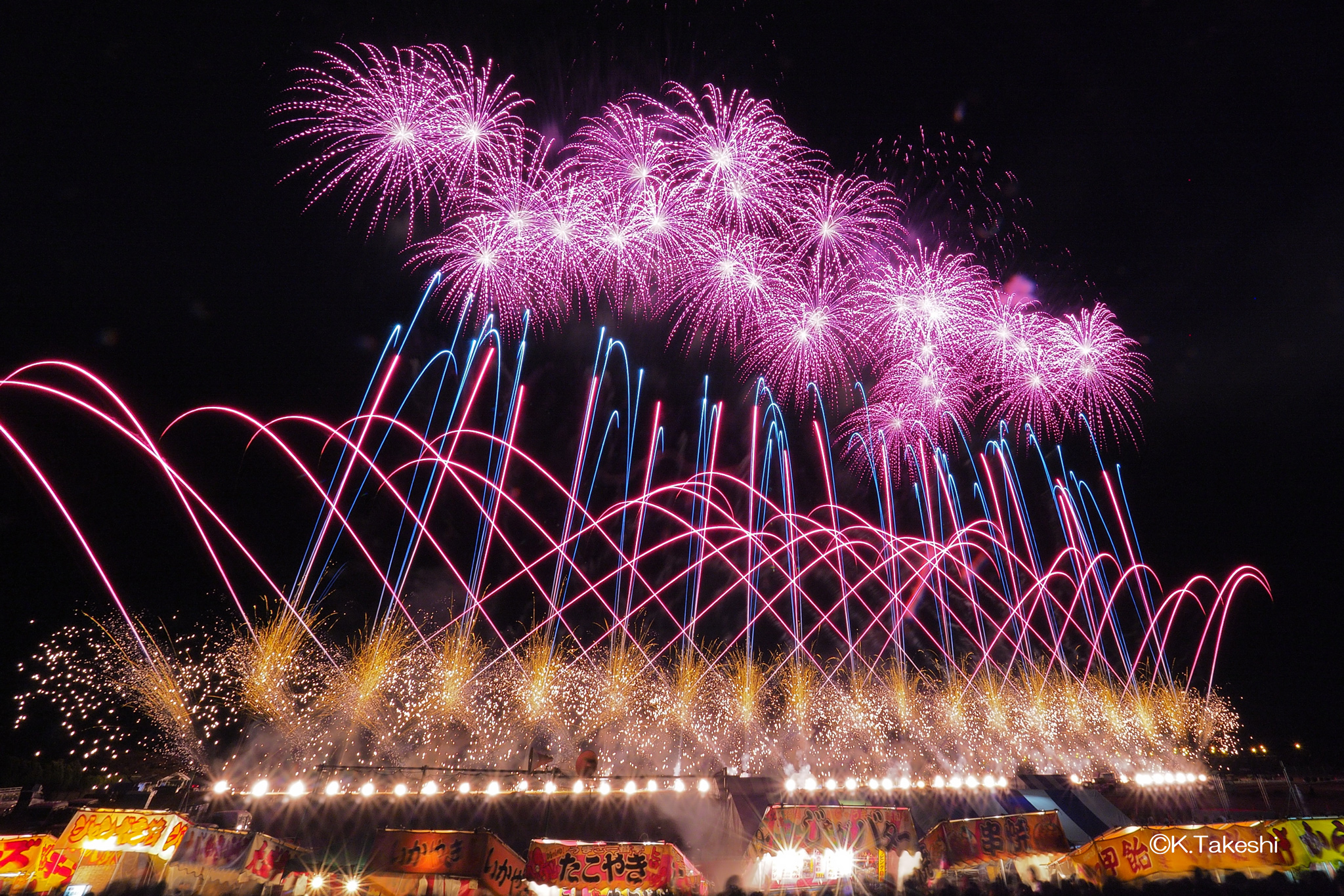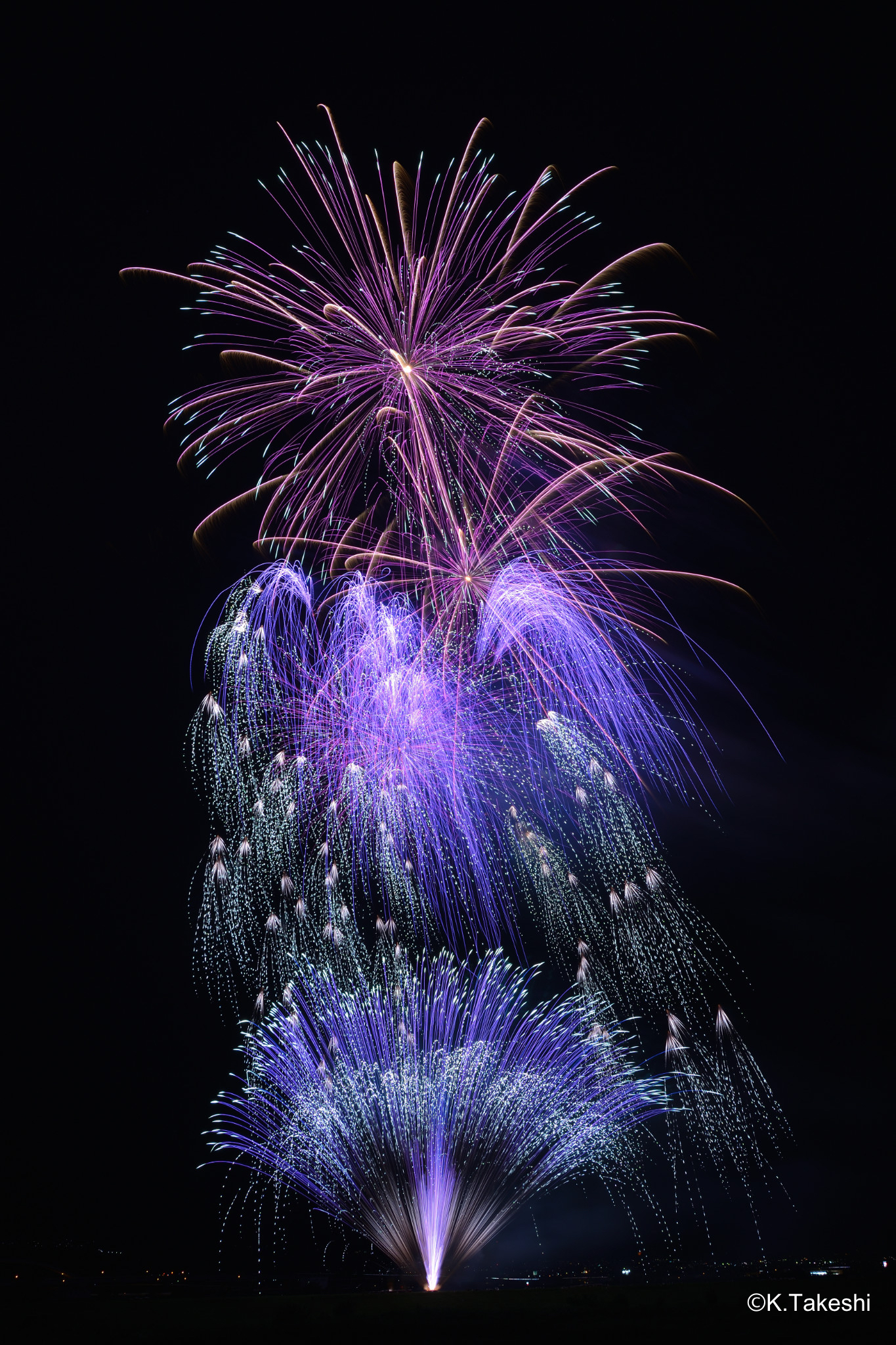 ISO 100, F8, 15.2秒, フィルター: ND4 / 山梨県「神明の花火」で撮影。上空には赤紫色の花火、中間には青紫と点滅の柳花火、地上では青紫の扇打上の噴出花火が重なって写っている。美しいスターマインだった。