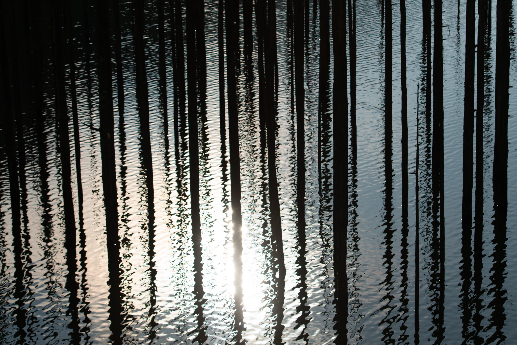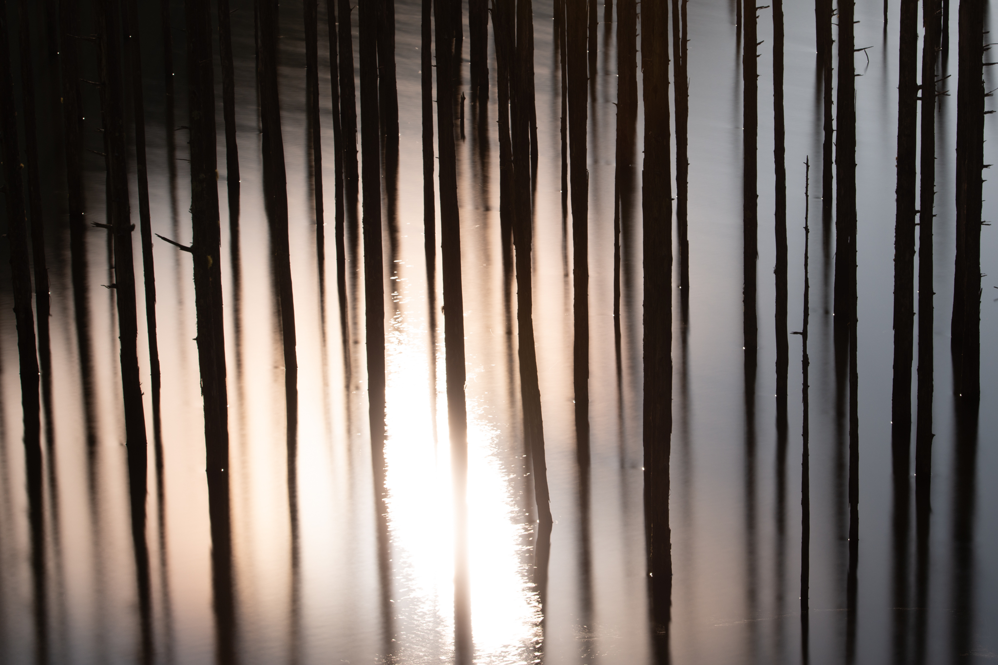 ここ自然湖は樹々の映り込みがとてもきれいな場所です。この日もリフレクションを狙って出向いたのですが、現地に到着すると、少し風が吹いて湖面が揺らいでいました。デメリットが発生したとき、それをメリットとして活かす撮影の仕方を考えます。といっても、急にアイディアは浮かびませんから、普段からいろいろな撮影方法を試し、表現の引き出しをたくさん持っておくことが大切です。このときも、風の揺らぎという新たな被写体をどのように取り込んで1枚の写真に仕上げるか、頭を捻りました。