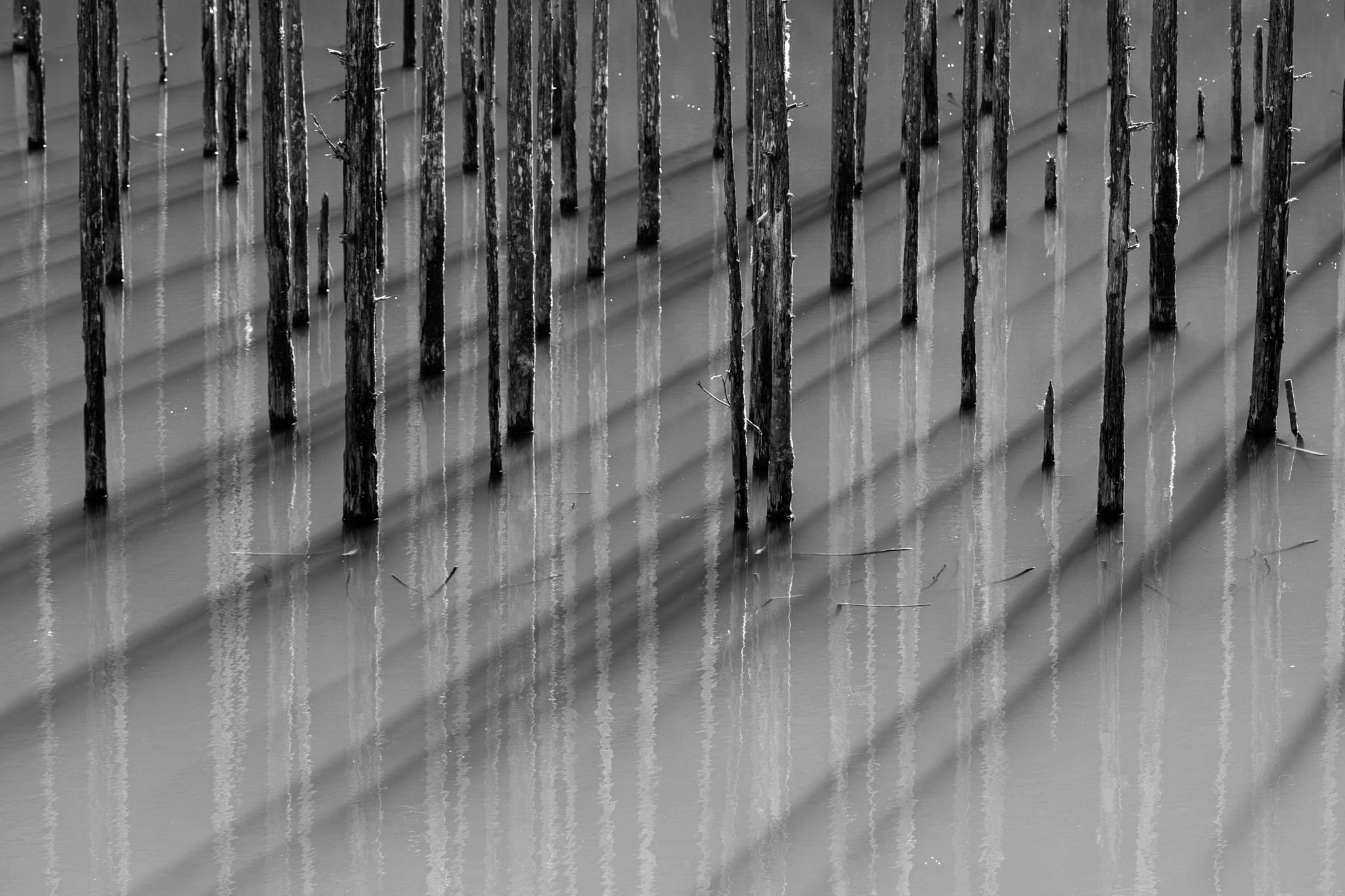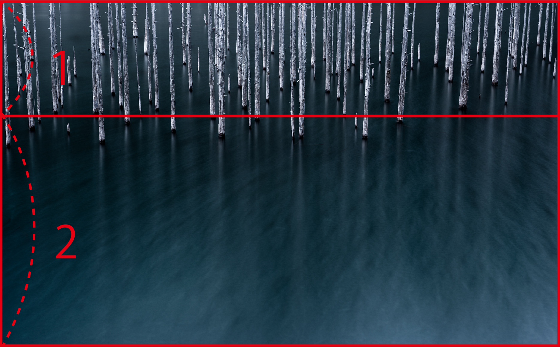 完全なリフレクションを狙うなら無風で湖面が凪状態になっているのが理想ですが、やや風が吹いていたので、発想を変えて「風の揺らぎ」をあえて入れることにしました。リフレクションを狙っているときは、樹々の並びが概ね水平になるように構図を整えますが、このときは右上に樹々の並びの凹みを入れることで、そこに注意が行くようにしました。風が右上から左下に流れてくるように見る人の視線を誘導したいと考えたからです。
