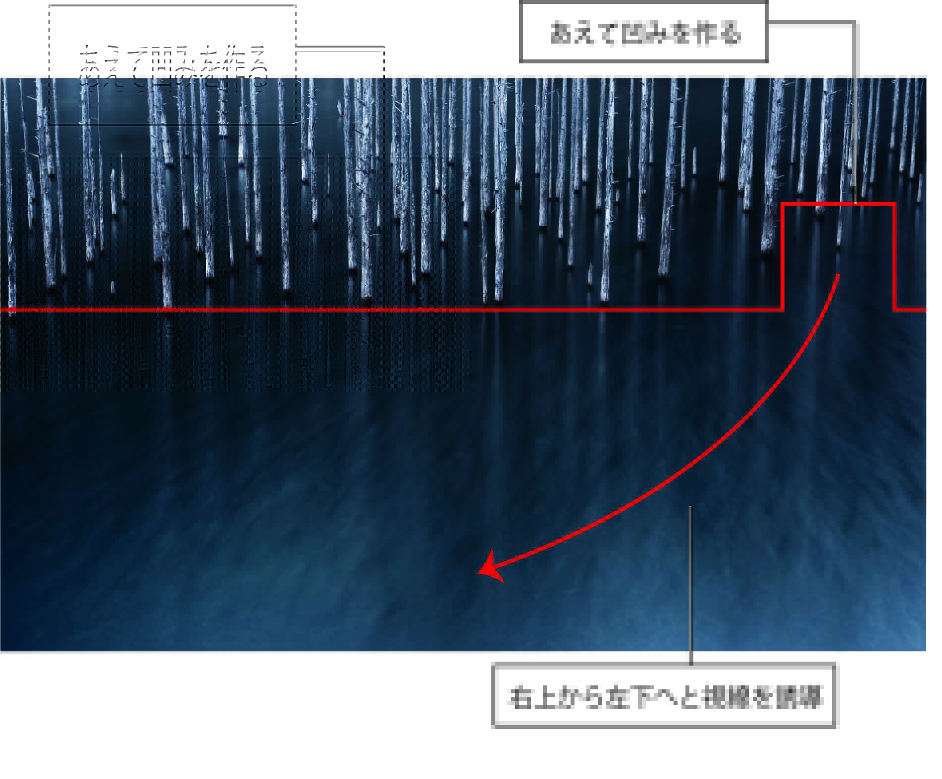 リズミカルに立ち並ぶ樹々に、あえて凹んでいる部分を入れると、違和感を感じて視線が向かいます。そこは風の流れの始点なので、左下へと風が吹き流れている様子を感じてもらうことができます。