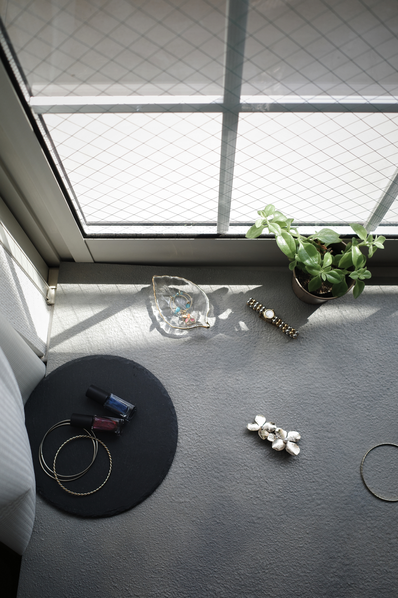 自然光と窓の格子の影がうまく入る時間帯が勝負。撮影と位置調整と画角決定のスピードが大切です。見せたい部分に光が当たるように位置を調整します。繊細なアクセサリー類を邪魔しないシンプルなグレーのボードを背景に選びました。