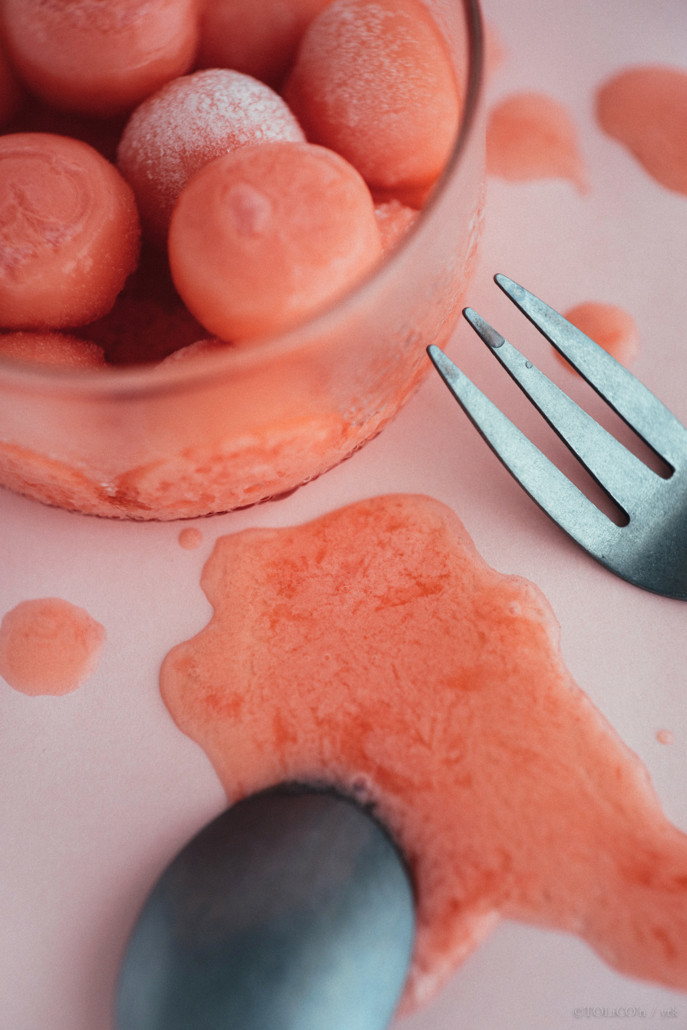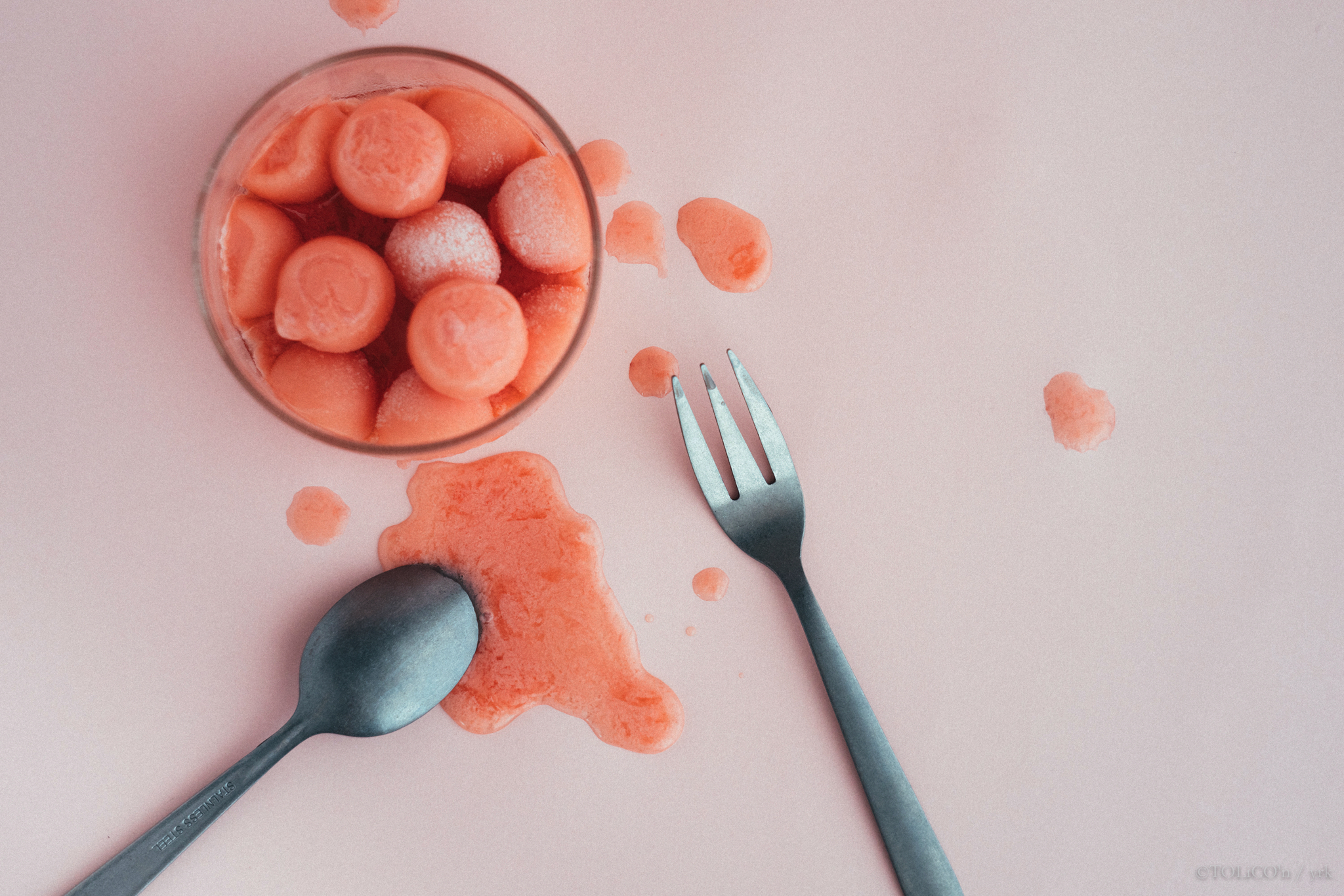 くすんだピンクの色が可愛らしかったので、背景紙も淡いピンクに。同系色を組み合わせるとふんわりした感じにまとまります。スタイリングに使ったカトラリーは、アイスより目立たないよう光沢のないマットな質感のものを合わせました。あえて1粒アイスを溶かし、それを紙の上で散らすことによって暑さの要素もプラスしています。
