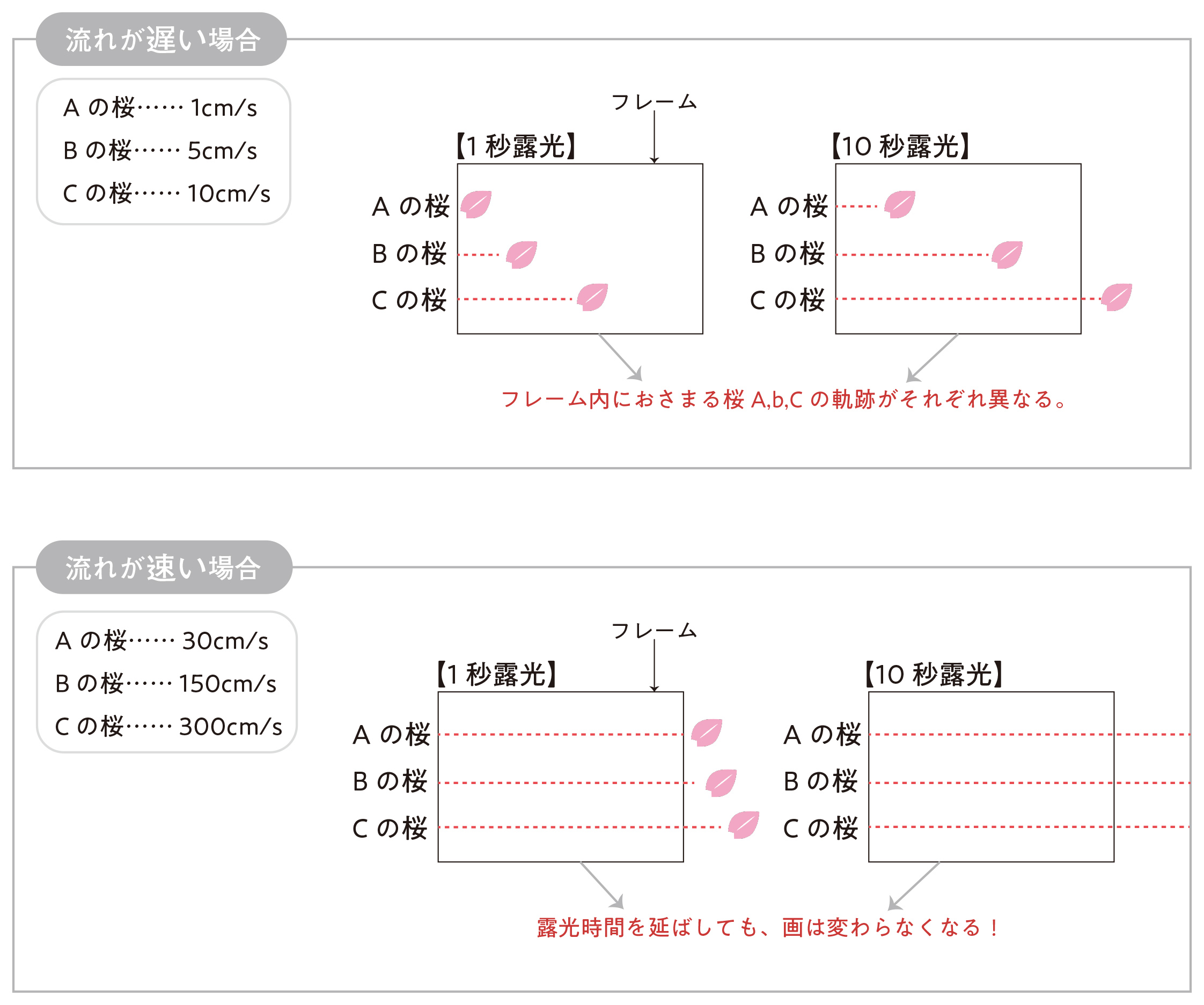 公園の一角にある池で、隅っこに花びらが集まっていました。観察していると、溜まっていた花びらが右から左へとゆっくり移動していたので、長時間露光で軌跡を捉えようと考えました。軌跡は実際には見えないので、どういう描写になるかを頭の中でシミュレーションします。