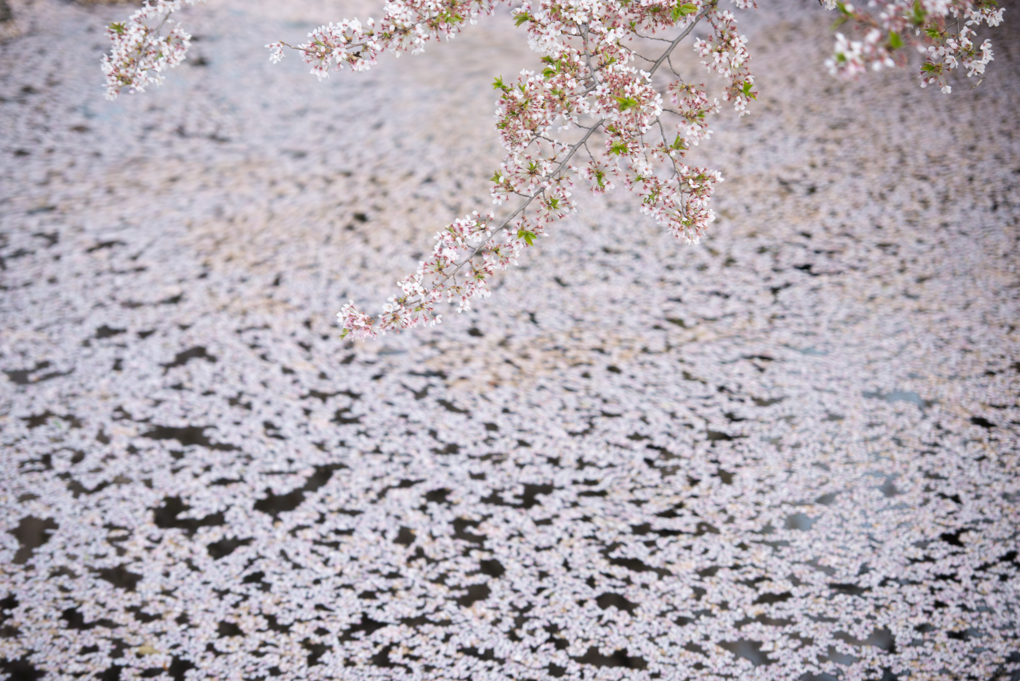 花びらなどの軌跡を何秒で描いたら良いかは、水の動きと風の強さによって異なってきます。桜の花びらのように池やお堀に溜まって、風の流れでゆっくりと動くようなシーンでは、長めの15秒前後からスタートして様子を見ながら、シャッター速度を調整します。軌跡の予測が難しい時は、1秒、2秒、4秒、8秒、16秒・・・とシャッター速度を倍にして、大まかな雰囲気を見ていきます。絞りは固定、ISO感度と可変式NDフィルターの調整でシャッター速度を変えます。
