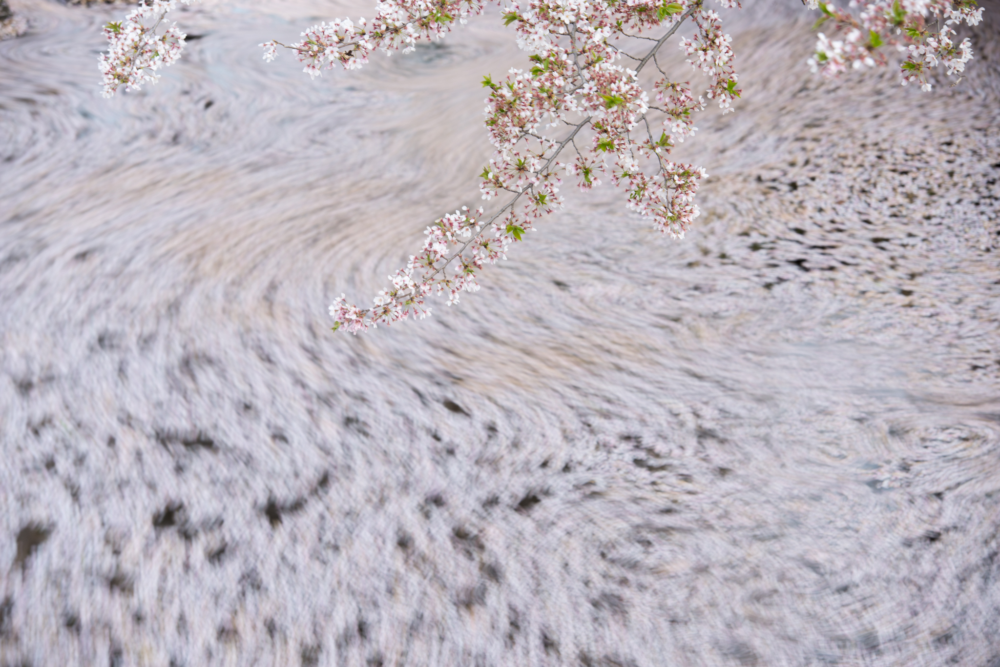 長時間露光で動いているものを写すと、形が曖昧になり抽象的な描写になります。そこで写実的なものを入れようと、動かない桜の木を入れてみたのですが、ありきたりな構図でいまひとつ面白くありません。やはり、桜の花びらだけで画面全体を構成したいと考えて、速いシャッター速度で止まっている花びらと、流れている花びらを多重露出で重ねることを思いつきました。カメラ内の多重露出機能を使い、1枚目は速いシャッター速度で止め、2枚目は長時間露光で流し、2枚を重ねました。