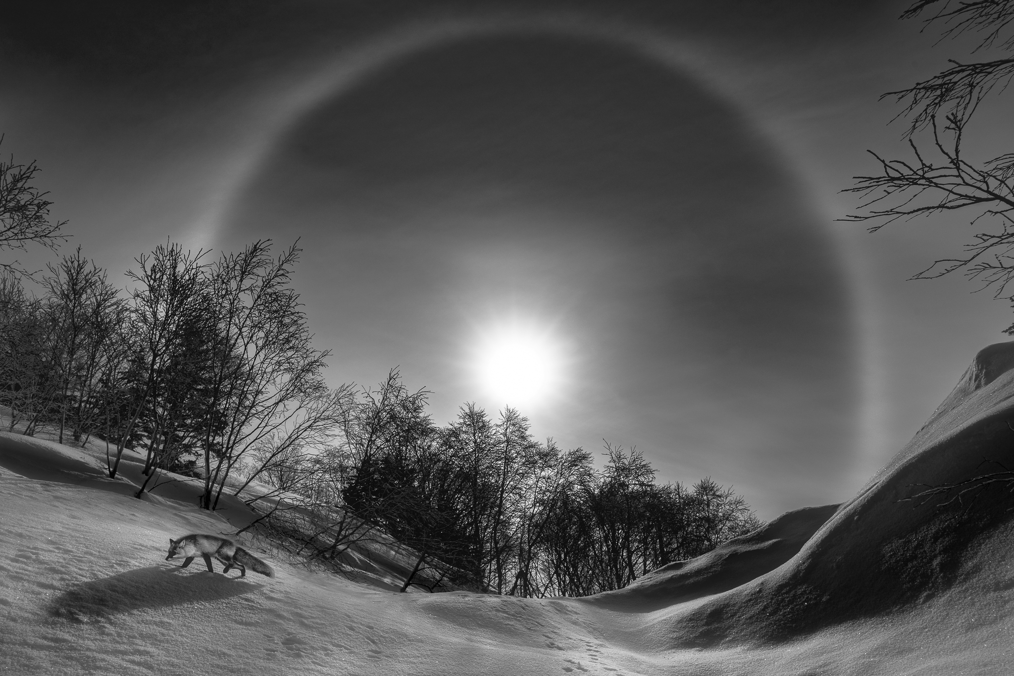 この日もキタキツネを狙っていたのですが、空を見ると薄雲の中にハロが出ているのが見えました。ハロは時間が経つにつれ薄くなったり、一部が欠けたりするので、きれいな円になっている時に、キタキツネが現れないかと、ずっと待っていました。そして、キタキツネは出て来てくれたのですが、なかなか画面の良い位置に来てくれない。やきもきしながらも高速シャッターで何枚も撮影し、やっと撮影できた1枚です。フィルターは使っていませんが、撮影したときからモノクロで仕上げようと決めていました。