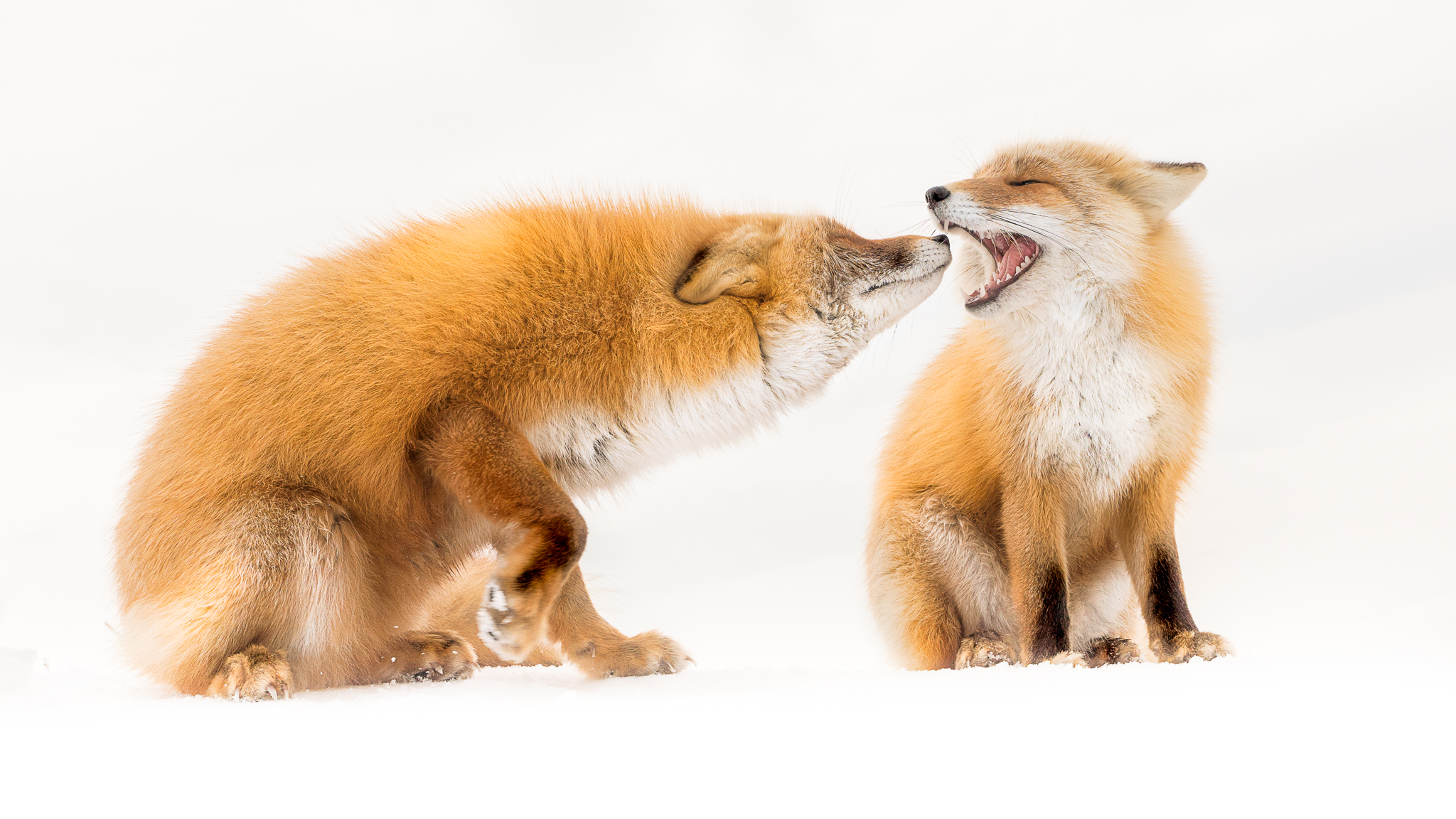 夢中で撮影した野生動物といえば、この写真がそうですね。キタキツネは口の大きさを競い合う習性があるのですが、野付半島でそれを見かけて、かなり近い距離で撮影しました。キツネと同じ目線の高さで撮りたかったので雪に寝転がり、1時間で5千枚くらい撮りました。大事な瞬間を逃したくありませんから。そのくらい、僕にとって野生動物は撮りたくなる被写体です。この作品はNature’s best Photography ASIAの野生動物部門に入選したもので、若干のトリミングや調整などをしていますが、さすがに現場でフィルターワークをする余裕はありませんでした。