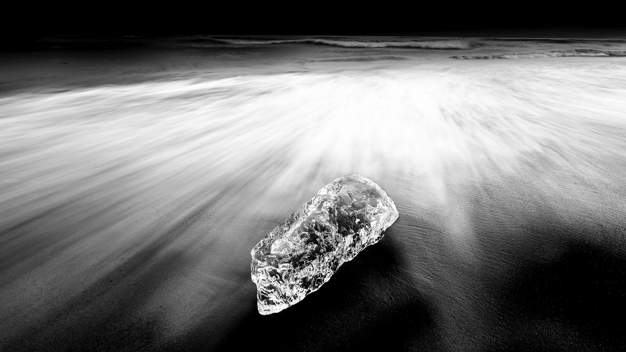 氷の透明感を出すにはモノクロにして、メリハリを付けた方が良いと思いました。波の寄せ返しを表現するためにND64を使い、背景の空が白トビしないように、GNDも使っています。後処理で調整できる幅を持たせておくためにも、白トビの無いデータにしておくことは重要で、その意味でも、GNDフィルターの果たす役割は大きいと思います。