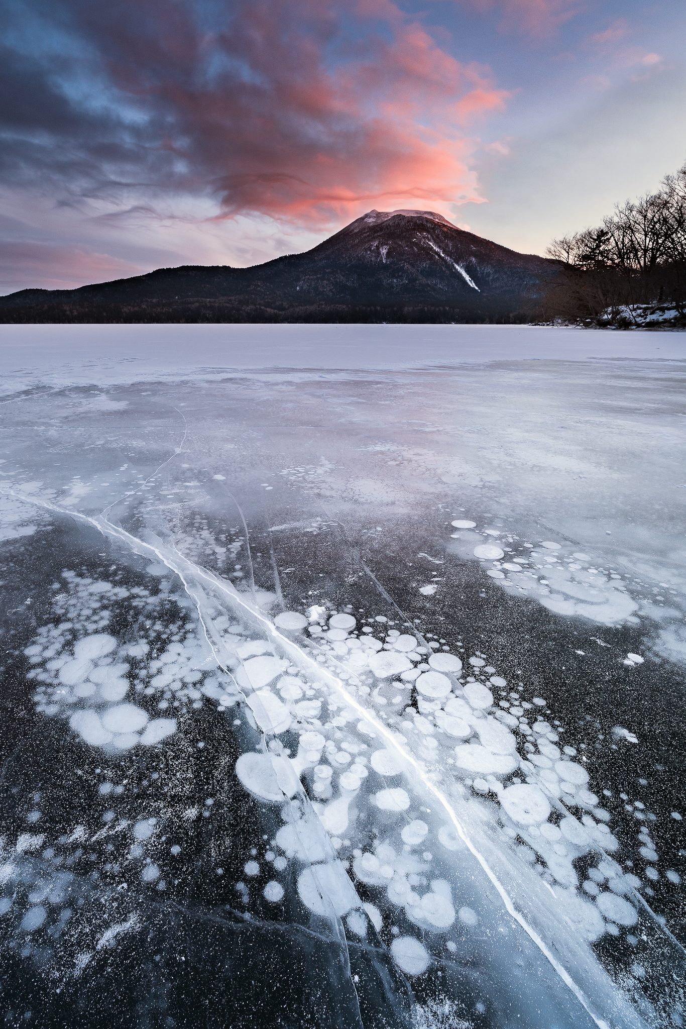この写真は支笏湖ではなく阿寒湖ですが、GNDフィルターで背景の山と朝焼けを見せながら、結氷した湖の表情を出すために、PLフィルターも併用しました。朝日の出る方角は、サン・サーベイヤーというアプリや、ストリートビューで調べて、背景の山と合わせて構図を決め、氷点下10度の中で、朝日が出るのを待ちました。PLフィルターを回し、氷の表面反射が消えると、湖底から発生したメタンガスの泡が、氷に封じ込められてできるアイスバブルが鮮明に見え、イメージに近い写真にすることができました。