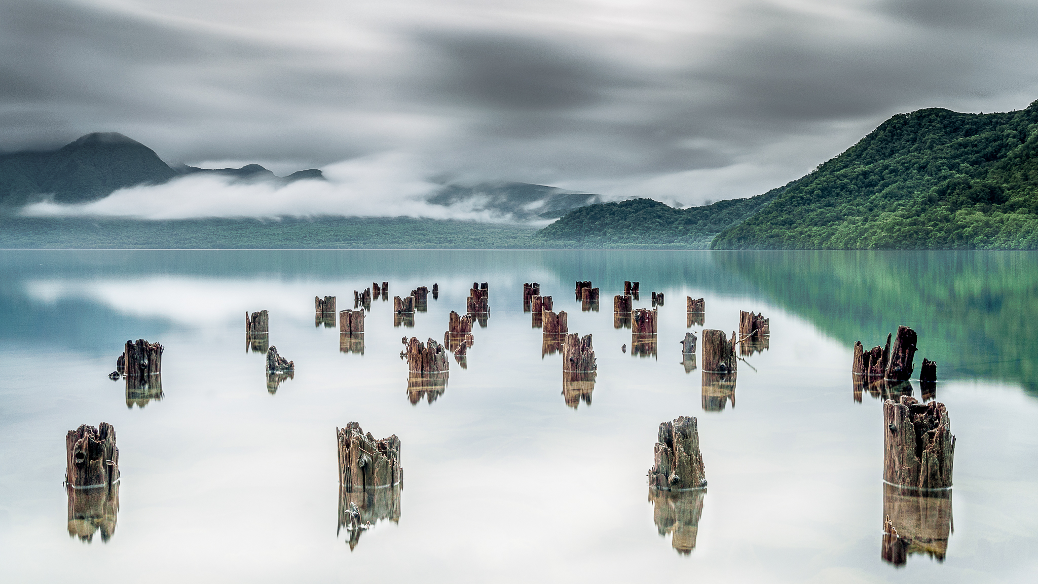 共通の知り合いを通して、支笏湖観光センターの方から声をかけていただきました。支笏湖へは自宅から車で30分ほどなので、毎週のように通っています。この写真は去年の6月に、美笛という地区側から撮影しましたが、本当は朝日に期待していたんですね。しかし、いつまでたっても曇りのまま。諦めて帰ろうと思いましたが、風がほとんど吹いていなくて、湖面に朽木がきれいに映っていました。それでND1000フィルターとGNDを使って、湖面の写り込みと雲の流れが出るように、長時間露光で狙ってみました。支笏湖は撮影ポイントによって、全く表情の違う写真が撮れるので、身近な場所ですが、すごく魅力的な被写体です。