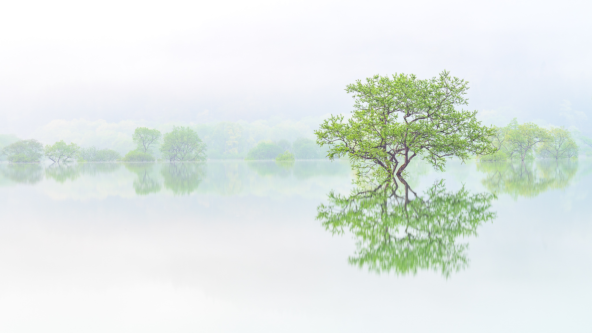 反対に水面の反射(写り込み)を鮮明に出すためにPLフィルターを使ったのが、この写真です。今年のゴールデンウィークに、故郷の山形に帰った時に撮影しました。ここは飯豊町の白川湖といって、白川ダムが作る湖なのですが、春になると雪解け水が大量に流れ込み、放水を始める間の限られた期間だけ、水没林が現れます。去年撮影に行ったときは晴れていましたが、今年は霧が出ていたので、水鏡と霧によって神秘的な写真になりました。