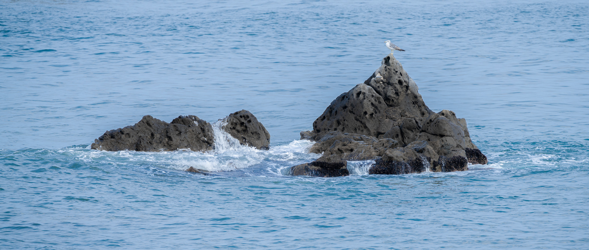 この時、シャッターを開けている時間は0.5秒。このくらいのシャッタースピードであればほとんどの場合、一匹のカモメが動きを止める瞬間に撮影することができました。波の形はどうでしょうか。このとき、波は5分に一度くらいの割合で大きく打ち寄せました。岩に打ち当たった波を狙うも、そのあと波が引いていく瞬間を捉えてしまうことが多かったのですが、その失敗と思われる写真から私は自分の捉えたい波の形に気づきました。引いていく波が岩を撫でる様子が、波のベールを纏っている様にも見えないでしょうか。私は薄いブルーの波が岩を覆うさまが素敵だと感じました。
