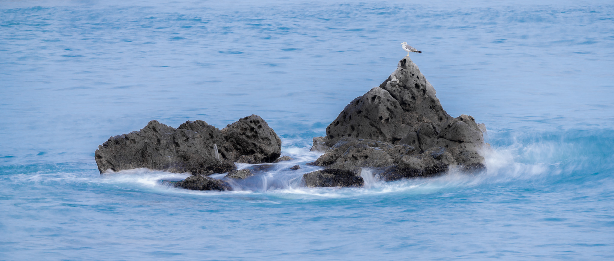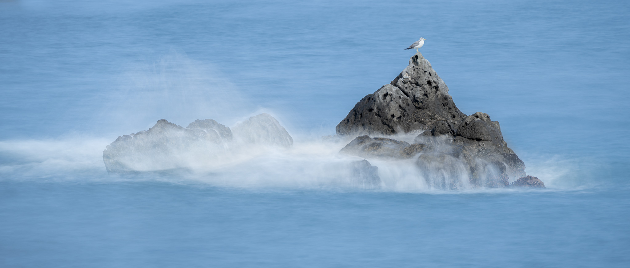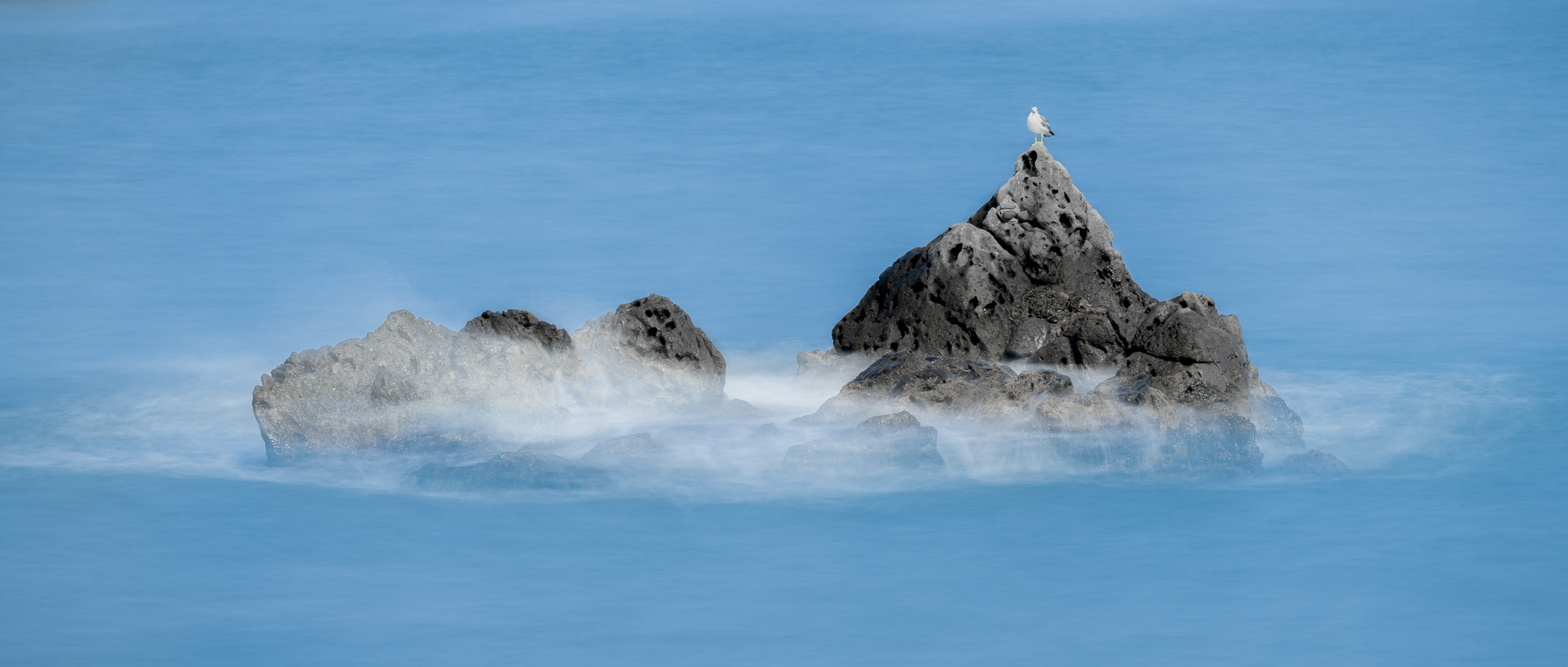 8秒という、人間でも止まっているのに一苦労しそうな時間、奇跡的にカモメはピタッと止まってくれていました。カモメを囲む青い海の表面はより滑らかに映し出されています。波の動きは抽象化され、白い霧のような波のベールが岩を優しく包み込みました。まるでそれは青い空に浮かぶ天空の島のようだと私は感じました。シャッタースピードを変えながら何枚もシャッターを切ってきましたが、この1枚が私の作品になりました。
