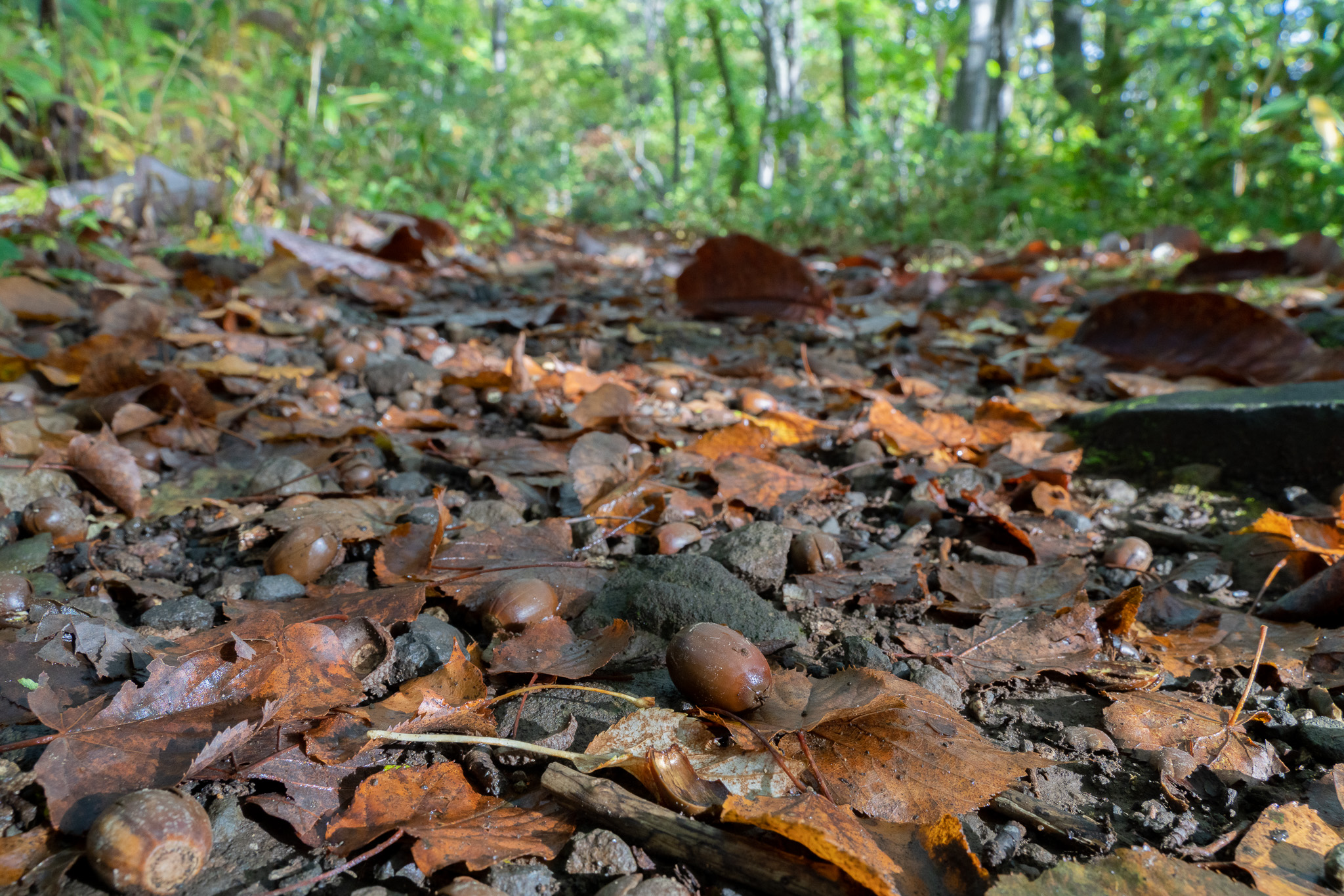 半月湖は羊蹄山の山麓にある火山湖です。その名の通り、上空から見ると半月のような形に見えることからその名が付けられたそう。半月湖の看板を目印に駐車場に到着すると、そこから散策路が続いていました。ミズナラやシラカバが自生する原始林の森です。森の緑はまだ青々としていましたが、足元にはたくさんのどんぐりや落ち葉。このどんぐりをリスや、ひょっとしたらクマも食べているのかも。そんな想像をしながらどんどん奥へと進んでいきます。