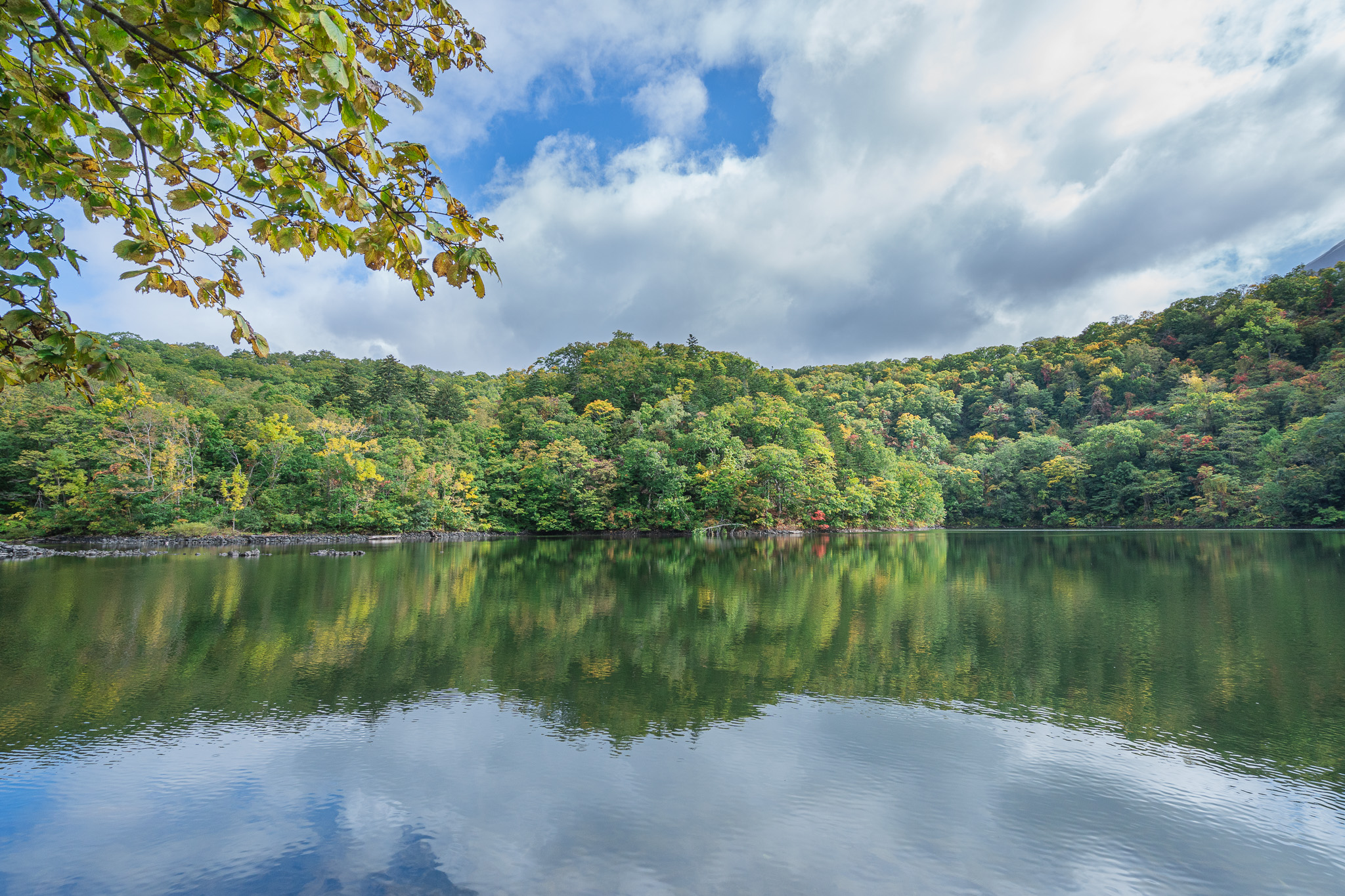 札幌から西へ100キロほどの場所にある羊蹄山。蝦夷富士とも呼ばれるその麓にある美しい湖、半月湖。そのひっそりとした湖畔で、色づき始めた木々が湖面に反射していました。
