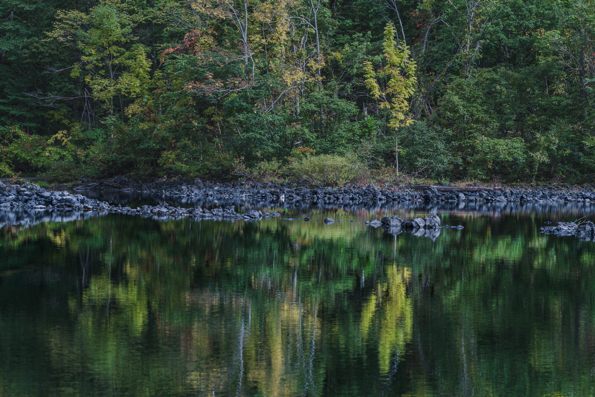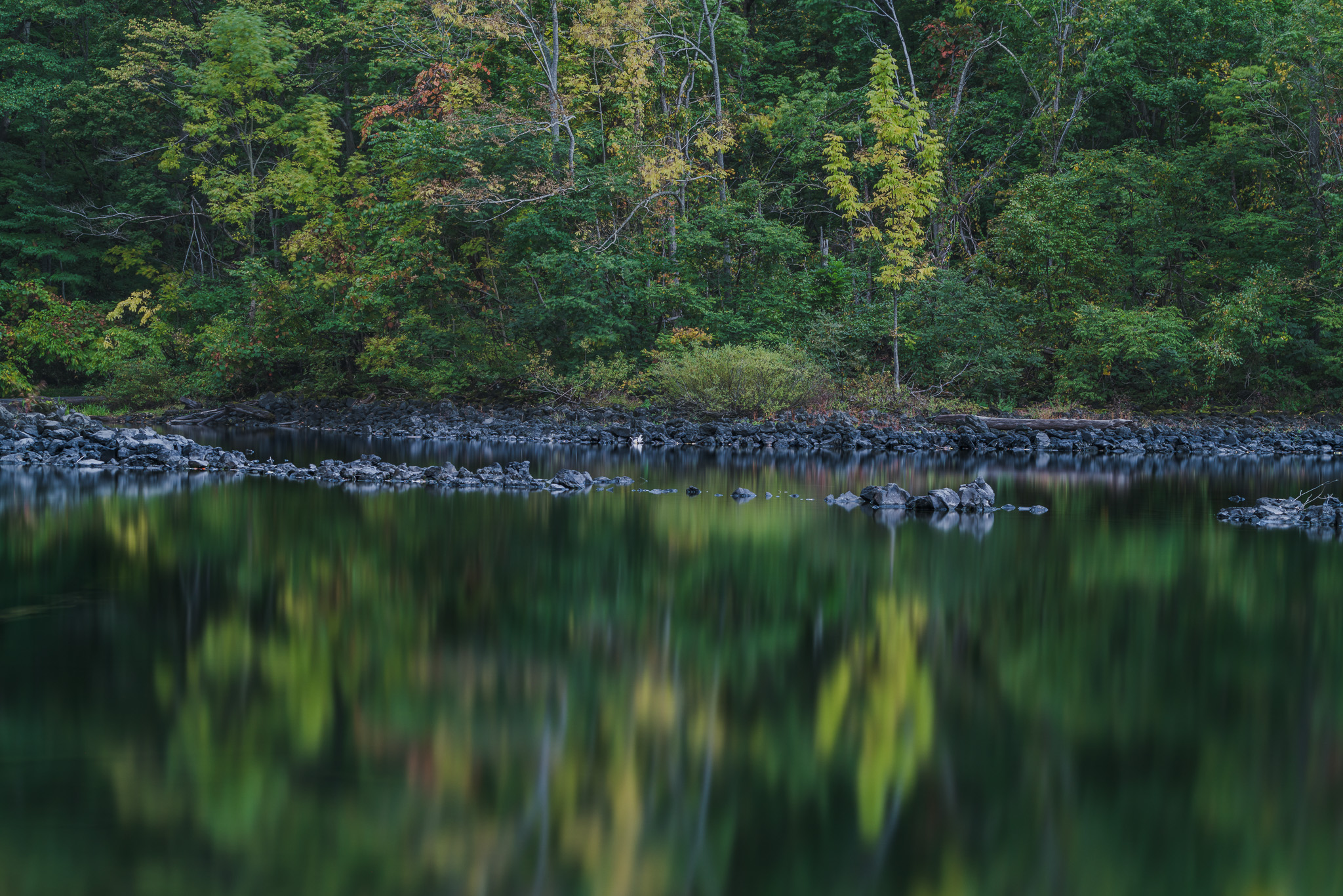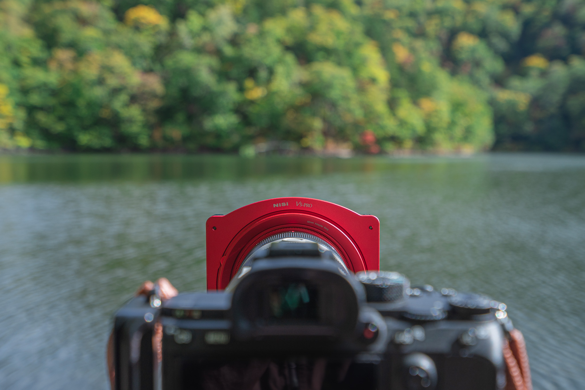 木々の反射はしっかりと湖面に映っているのが見えます。しかし、少し風が吹いているので、水面に映った木々は水面のゆらぎのために鏡のような反射にはなっていません。日が昇りきった時間、風が止むことは期待できません。そこで私は思い切って長時間露光に切り替えてみたらどうだろうと思い、フィルターを使用してみることにしました。ある程度の露光時間が欲しかったので、フィルターはND1000を用意します。