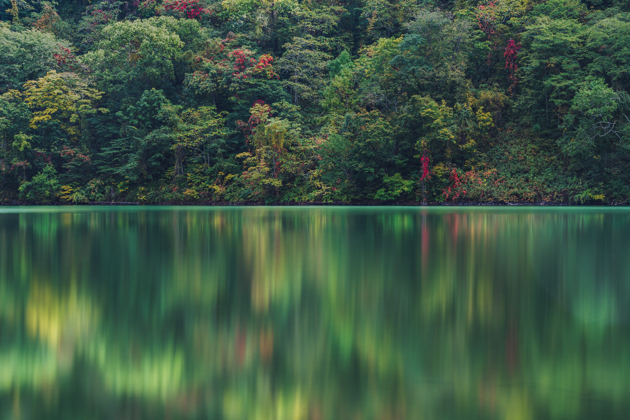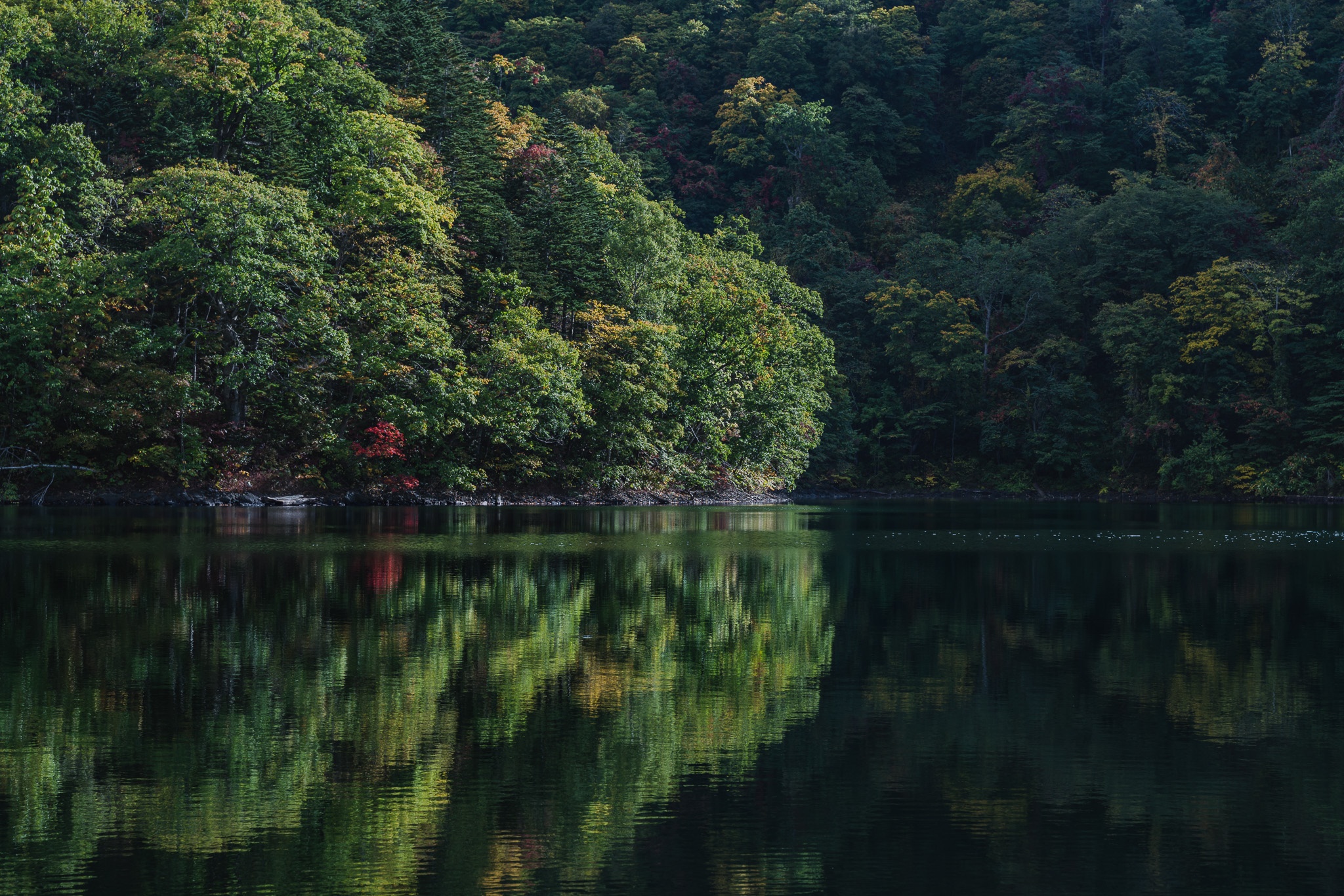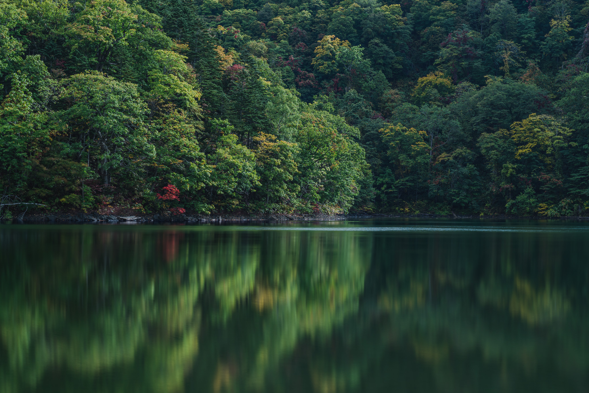 緑の中に映える赤や黄の葉が湖面の中で淡くにじみ、現実世界とは異なる幻想的な世界を作ります。まだ緑の多い季節だったからこそ、ぽつぽつと色を変えた葉がより引き立ちました。北海道では季節ごと、もしくはもっと短い期間のうちに次々と色々な草花が姿を現していました。その雑草の美しさもさることながら、様々な木々、植物が自生する北国の原生林では、紅葉の季節を迎えた今、色あざやかな姿を見せてくれました。その木々が湖面に映る風景を絵画のように写し撮りたい。その思いが叶った1枚となりました。