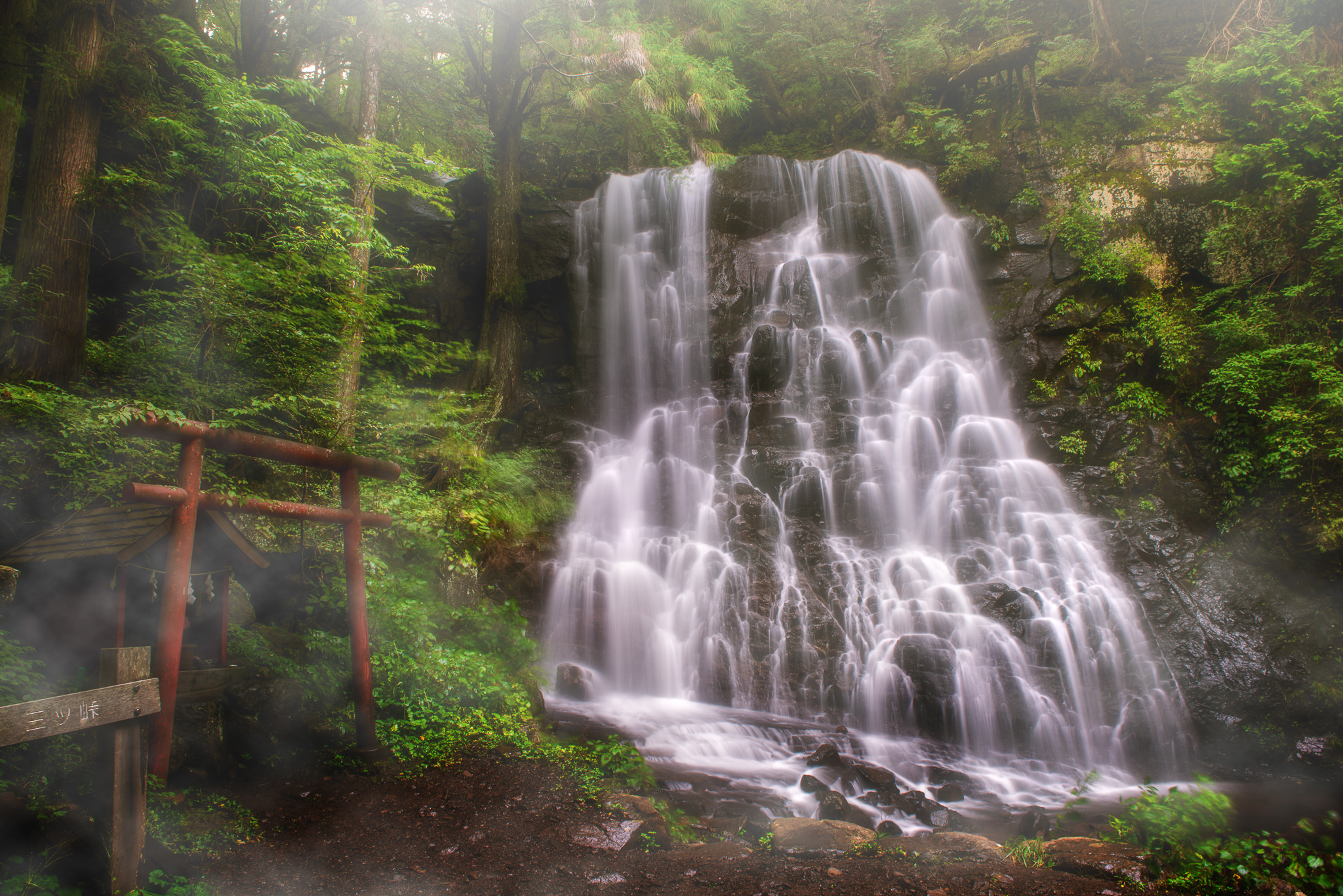 例えばこの写真は、三つ峠山道入り口にある有名な「母の白滝」ですが、NDフィルターで水を流した写真をベースにレタッチしています。この時は、不要なものを消すレタッチ、湿っぽい霧のレタッチ、柔らかい光のレタッチ、の練習のために作成しました。実際には鳥居の横に白い大きな看板があったり、全体的にある霧や上部の柔らかい光はありません。