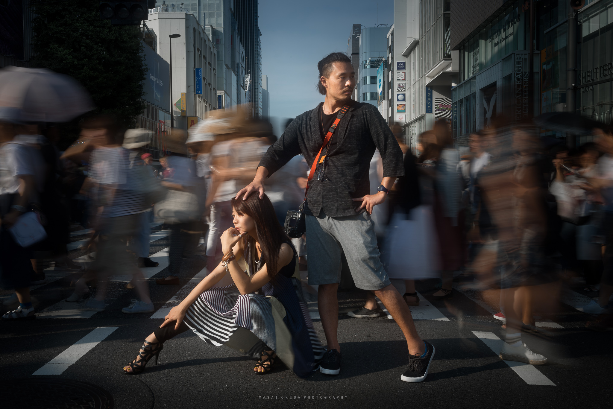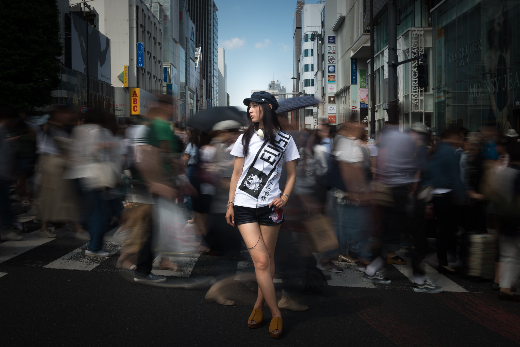 このカットを撮ることを含め、その日一日、彼女のポートレイトを撮っていたのですが、スローシャッター効果で背景の人を流して写すことを狙い、撮影場所は通行人が多い、東京・明治神宮前の横断歩道にしています。同じ場所で何回か撮影した経験をもとに、止まっている人物に立体感の出る光線が差し、背景の抜けがよくなる時間帯と方向を選んでいます。日中に背景の人を流す撮影なので、NDフィルターだけでなく、三脚も使ってシャッタースピードは1/3秒に設定。モデルさんには気合で止まってもらいました。(笑)