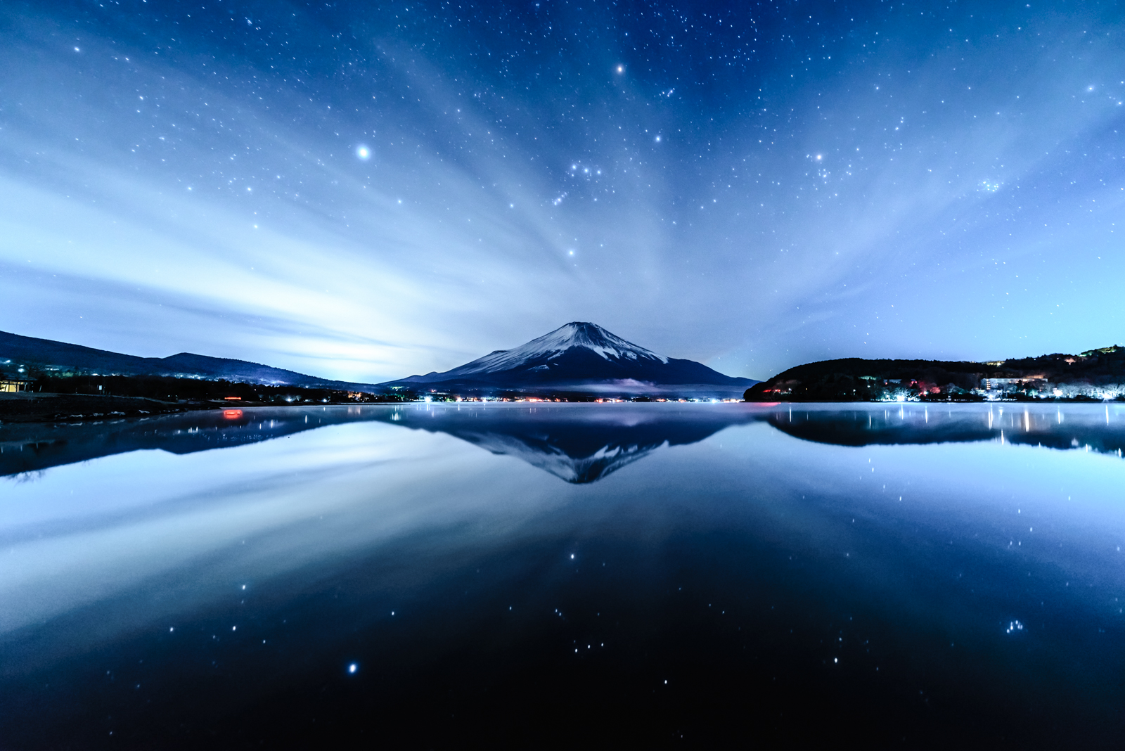 この写真は、モノクロでもブルーインク(青ベースのモノトーン仕上げ・Takashiさん独自のシリーズ)でもやってみました。しかしカラーの方がこの写真には良かった。やっぱり星=宇宙に富士山が浮かんでいる感じを出したくて、湖面を少し明るくしています。意識的に上下左右対称にして、雲がほとばしるようにしました。