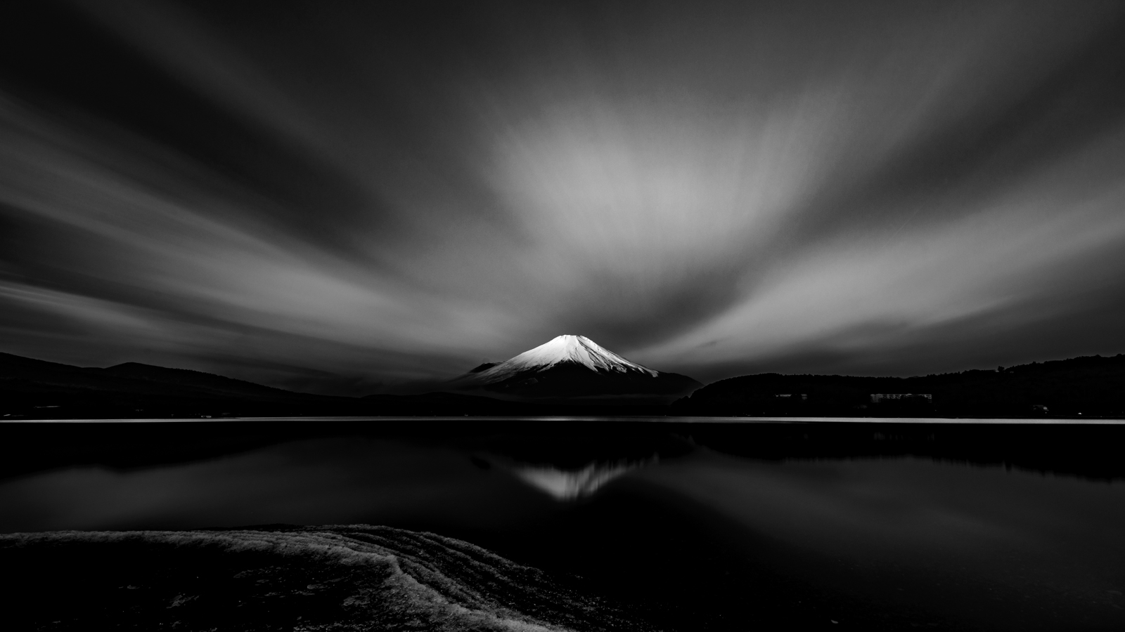 モノクロにしたのは、カラーだといまひとつ印象が薄かったからです。雪の部分のコントラストが弱かったし、湖面が地面の茶や空の青を写していると、視線があちこちへ泳いでしまう。モノクロにすることで、雪の白がくっきりし、雲の流れ、富士山の雪、そして横に流れる線だけになりました。