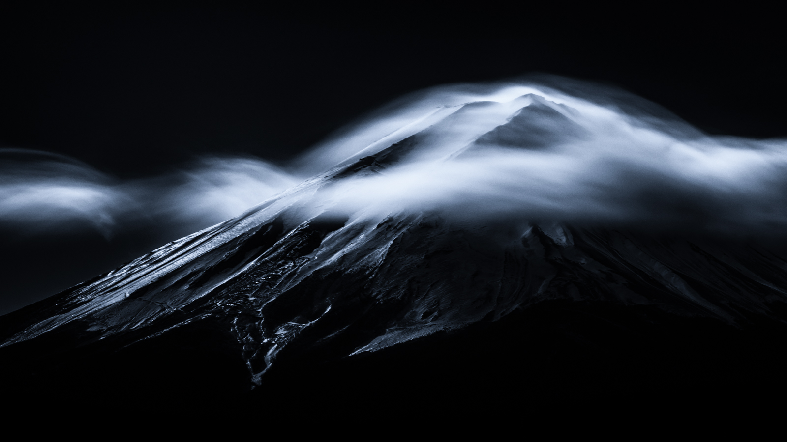 このときは雪が少なくて、富士山の表情がつまらないでしょう? 冬の真っ白な雪肌じゃないので、あまりきれいじゃない。そこにちいさな雲が、富士山の周りを消えては現れ、現れては消えて、右から左に移動しながら、流れていてたんです。これを普通に撮ると、まるい雲がぽこぽこあって、富士山の山頂も霞んでいるようにしか撮れない。実際には、雲がかぶったり消えたり、そういう変化をしているのに。それを長秒露光にする事によって、雲の動きが流れとして表現され、山頂に霞がかかって見える。