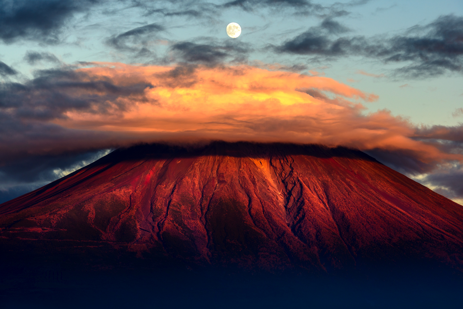 その後、月が出る直前になると、さらに雲が大きくなって、今日は誰もがダメだと思って諦めたとき、私はひとりで左方向(北方向)に3キロほど移動しました。なぜなら、雲の上空に出てくる月を撮ろうと思ったからです。はじめにいた場所では、月が富士山頂にかかった雲のさらに上空に出る頃には、富士山の右上に出る計算になる(月も太陽も星も斜め右上に移動しながら昇ってくるから)。雲の上空に出た月が、ちょうど富士山の真上に来る位置を目指して左方向(北方向)に移動したんです。目指すスポットに到着するやいなや、沈む直前の夕日を浴びて山頂は赤く色づき、雲はオレンジ色に輝き、そして狙い通り雲の真上に月が姿を現しました。月の明るさと富士山の明るさがちょうどよく、月の模様もしっかりと写すことができました。ここでは残念ながらフィルターは使っていません。雲を流したいとは思いましたが、月も流れてしまいますから。